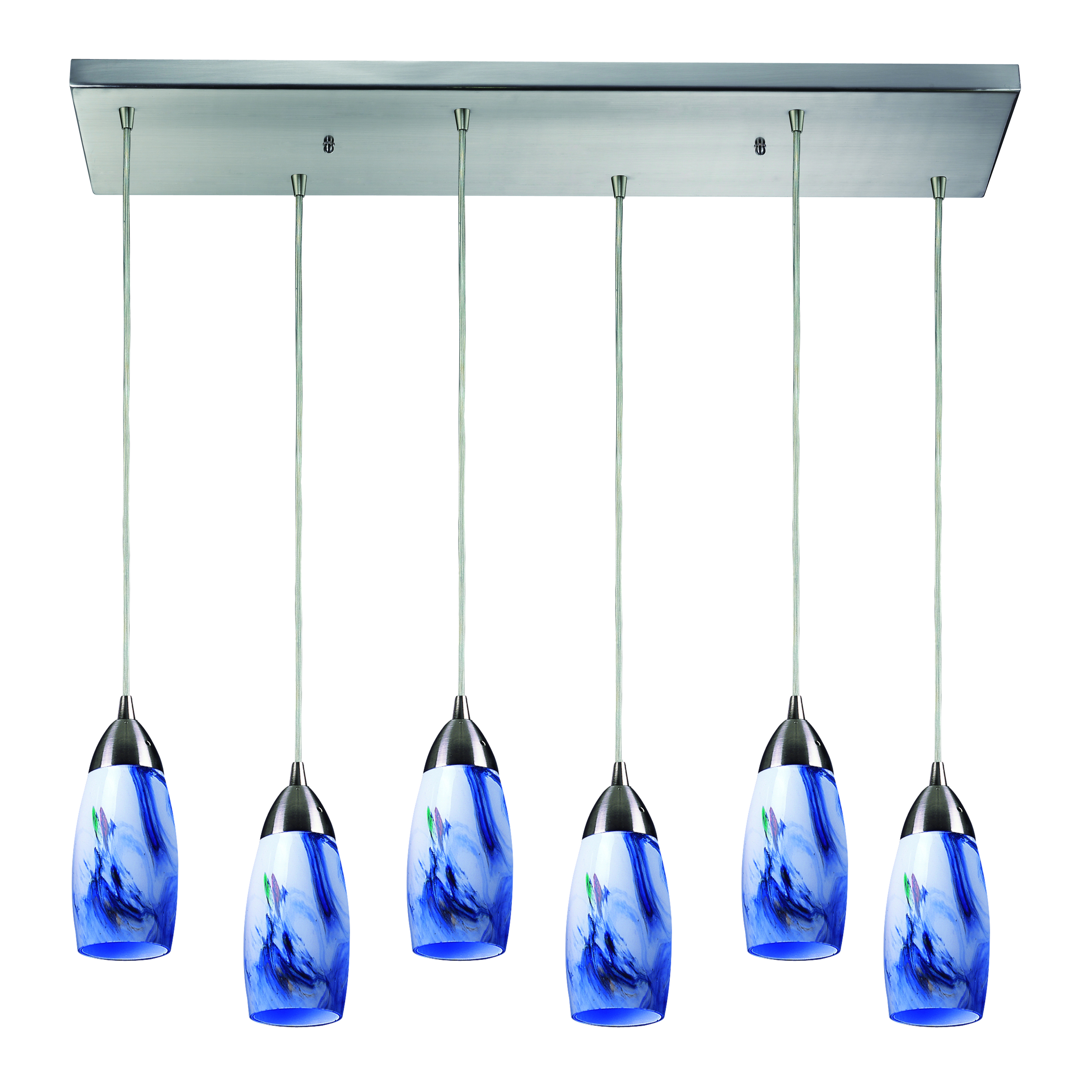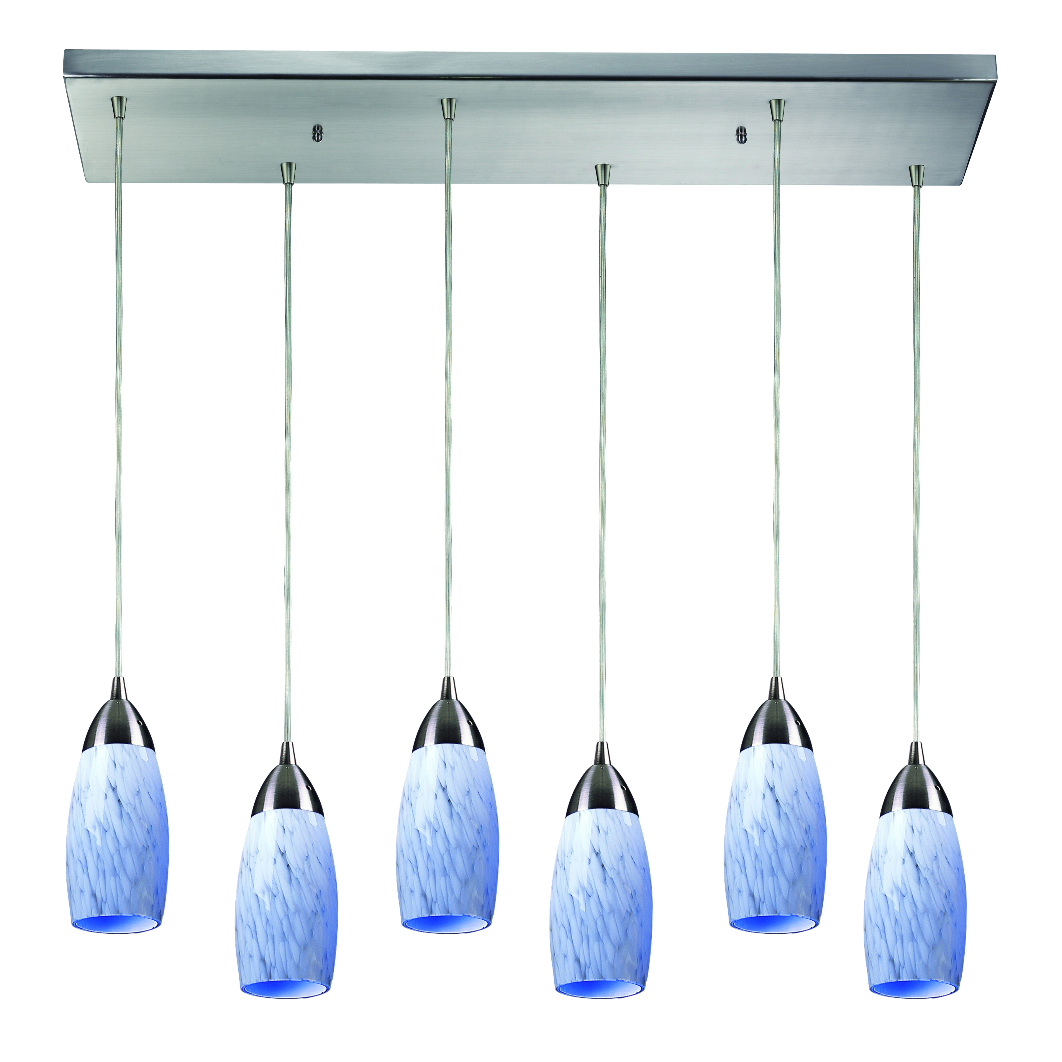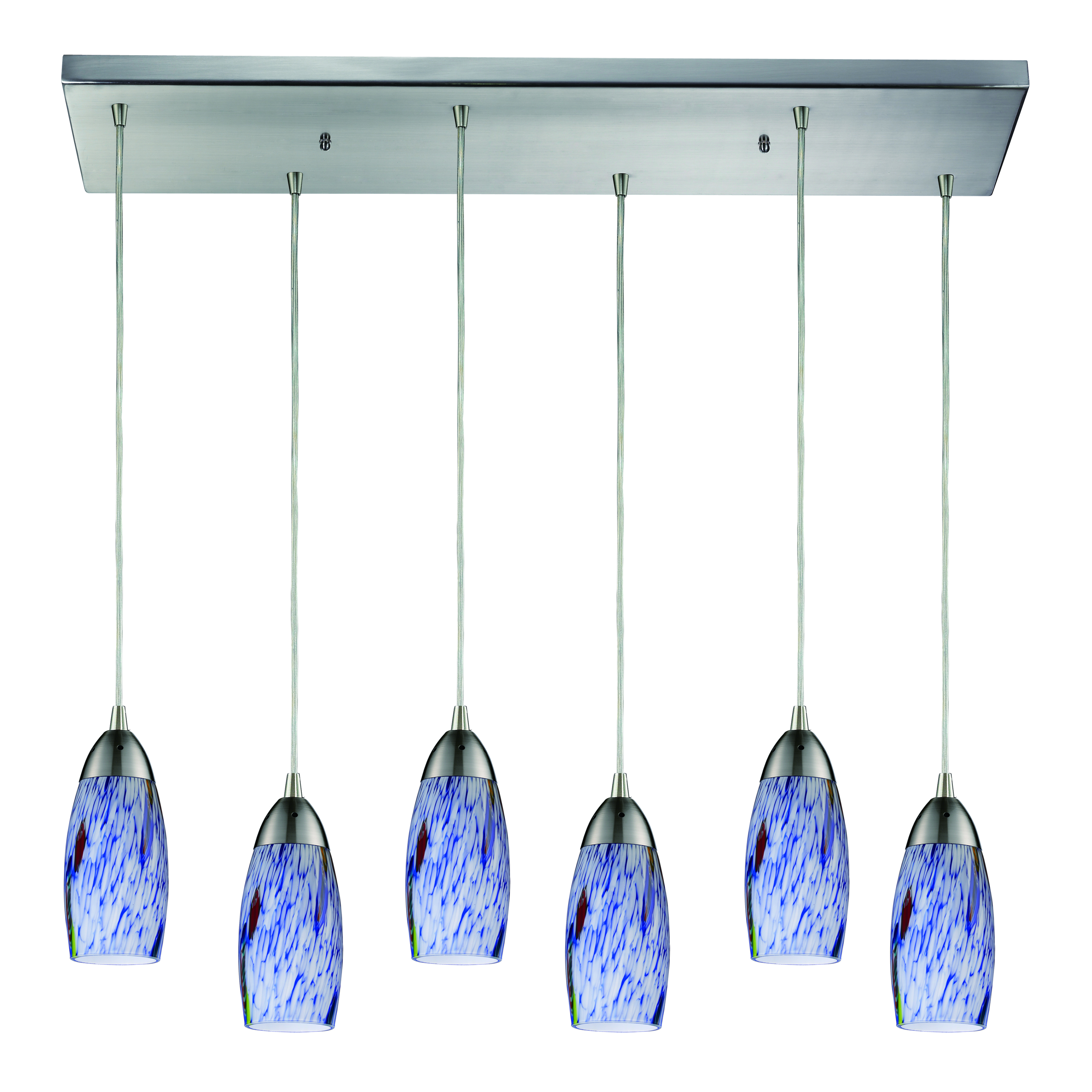 Milan 30'' Wide 6-Light Pendant - Satin Nickel with Starburst Blue Glass