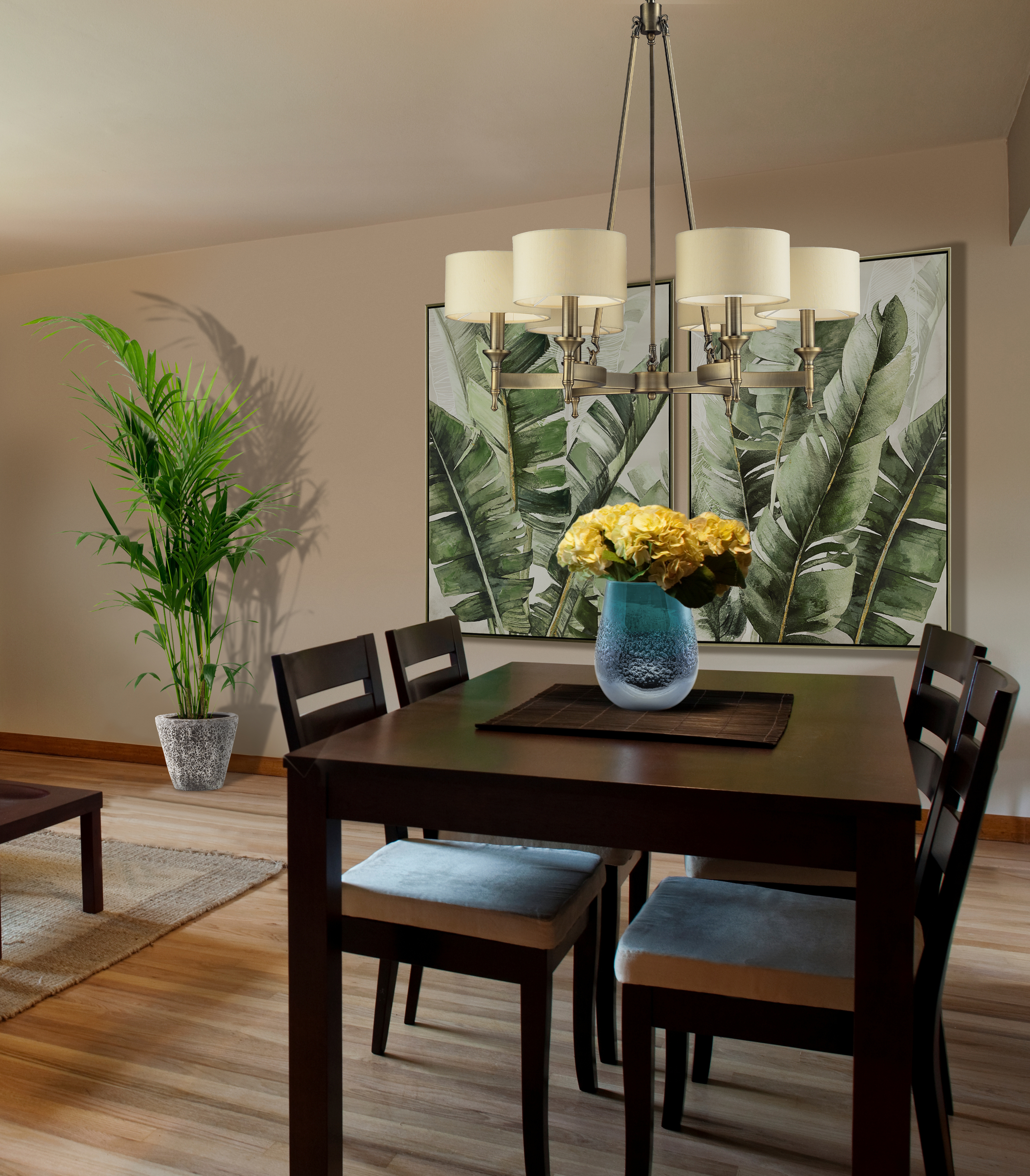 Unique in form, the Pembroke collection features a concave arm design for a distinct appearance. Choose from a Polished Nickel finish with light silver drum shades or Brushed Antique Brass with light tan shades.