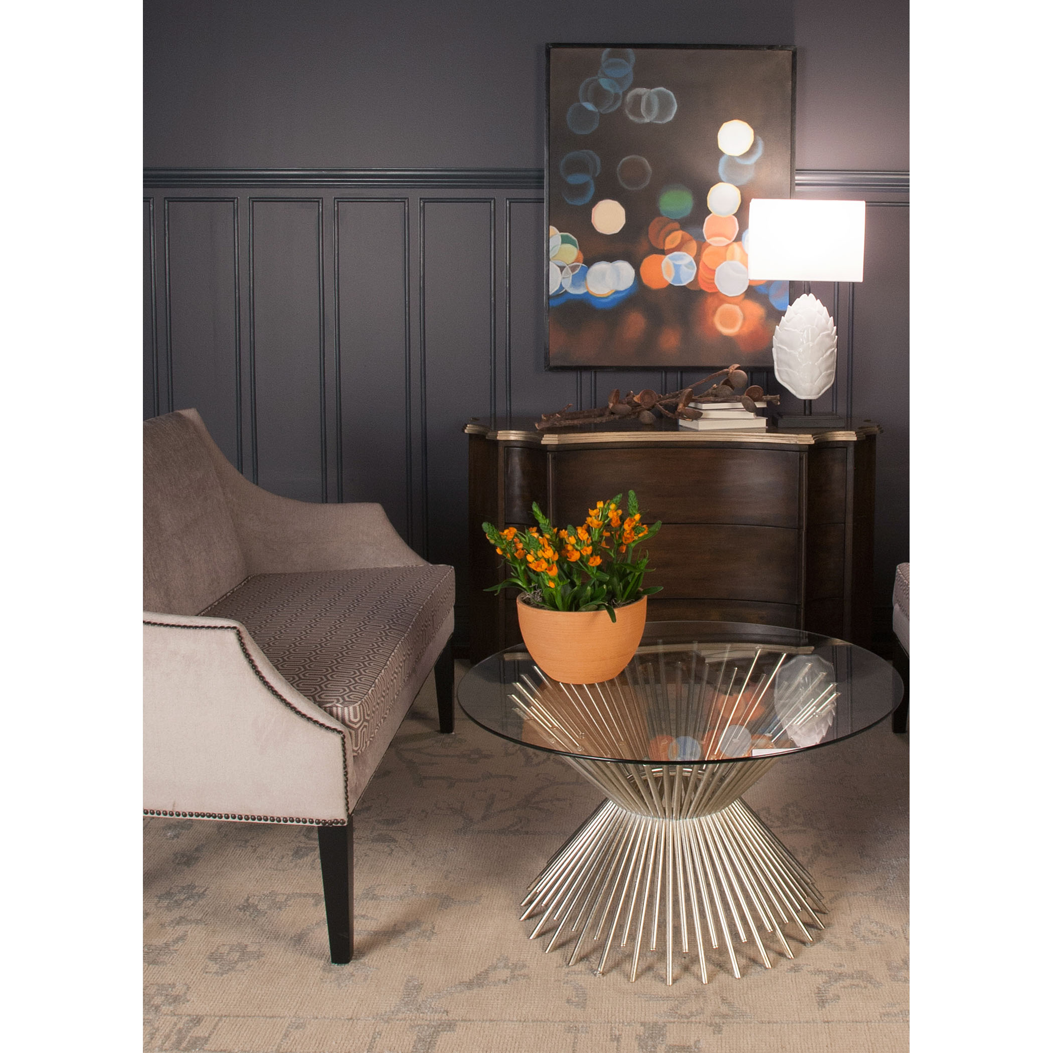 Utterly unique and always bold, Machine Age - Art Deco design stories mean the flawless synthesis of the lavishness, optimism and sturdiness distinctive to history's bourgeoning industrial epoch. Our beautifully handcrafted Brussels Coffee Table blends the hallmark exuberance of the Deco Lightburst motif with a gorgeous Champagne Gold color story and durable metal with tempered glass construction.