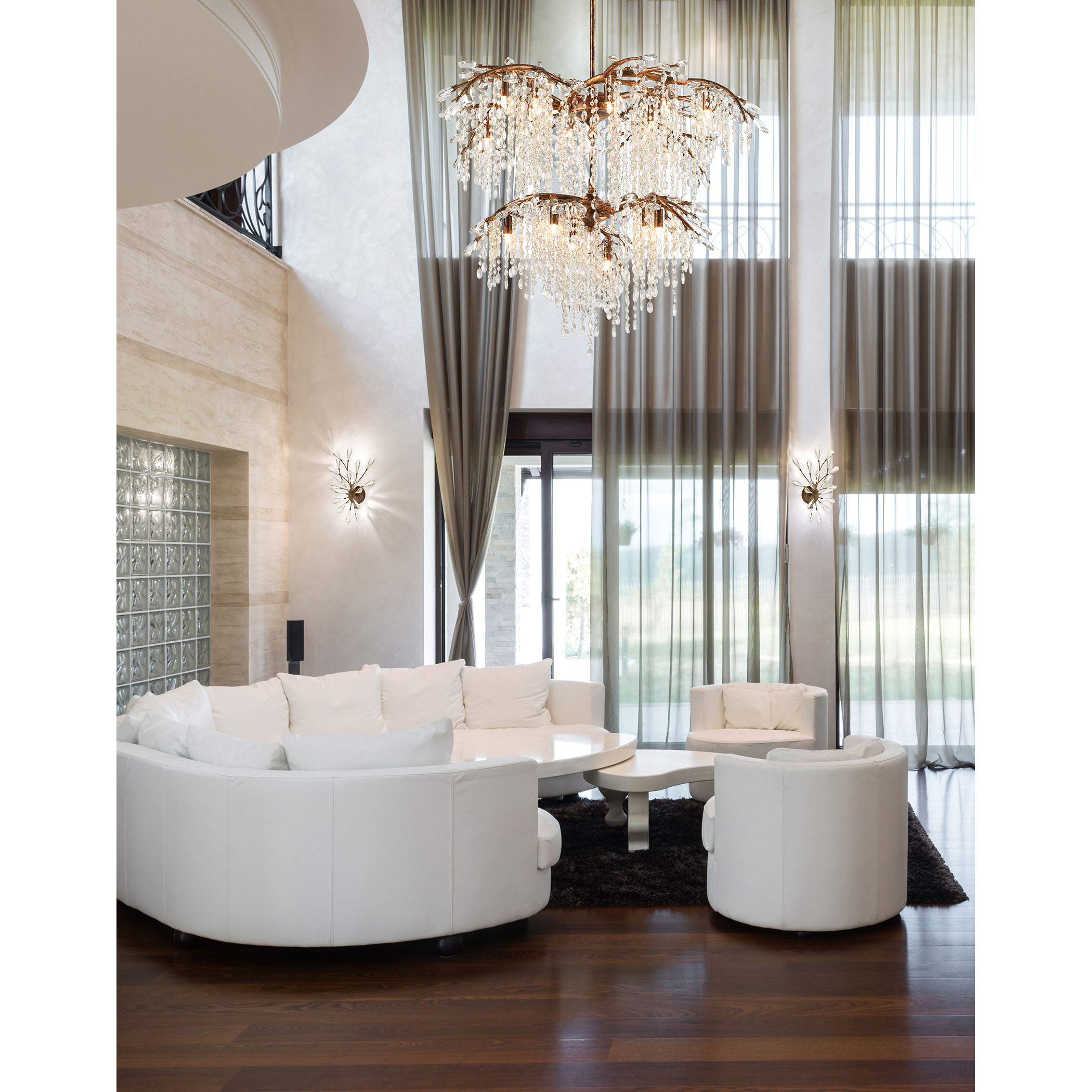 The Elia collection features “branches” finished in Spanish bronze, and cascades of shimmering crystal that create an organic inspired work of art.