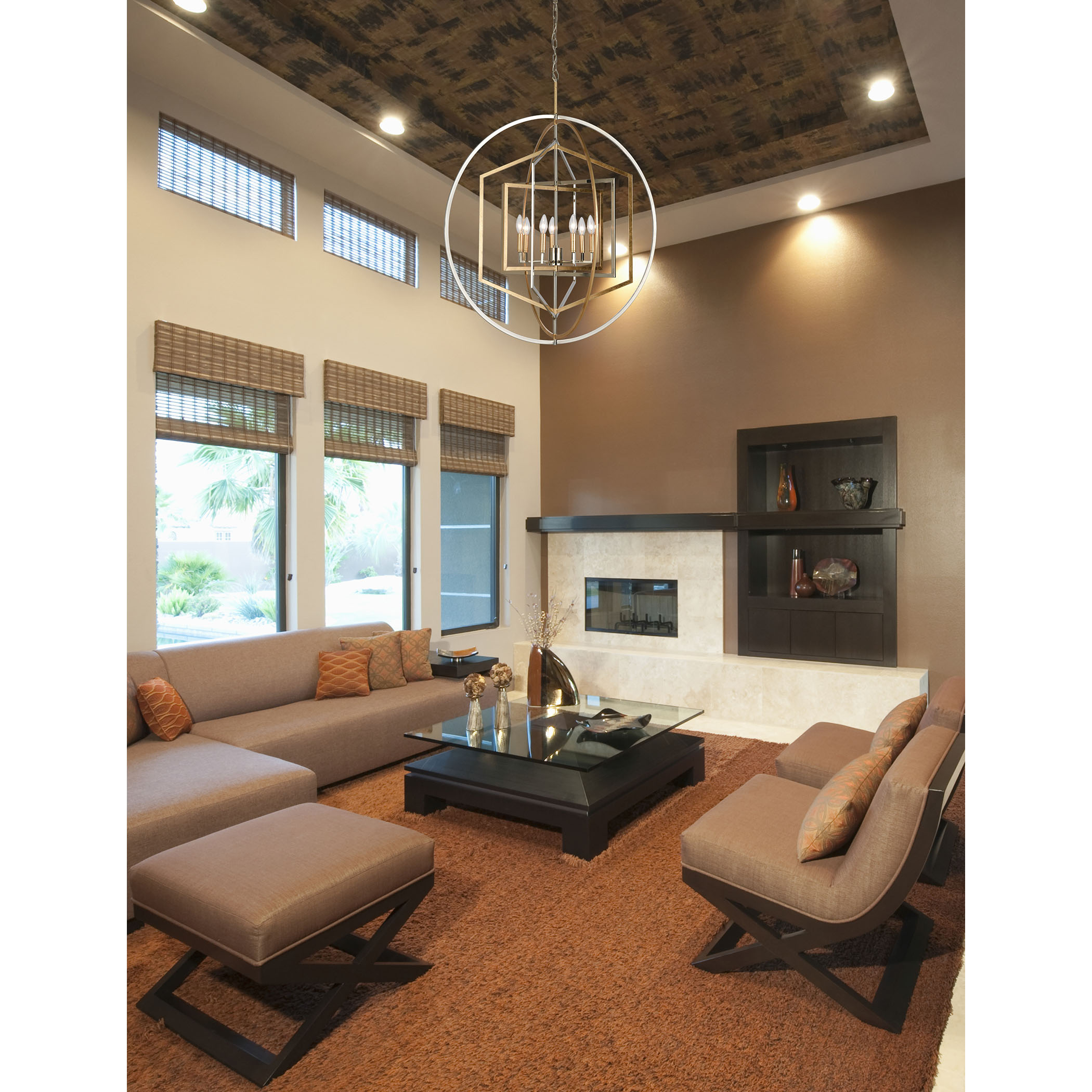 The Geosphere collection has a unique array of geometric shapes which nest inside each other. The shapes on the chandeliers can be rotated to a desired position after installation. A Parisian Gold Leaf finish is accented with Polished Nickel for a luxurious presentation.