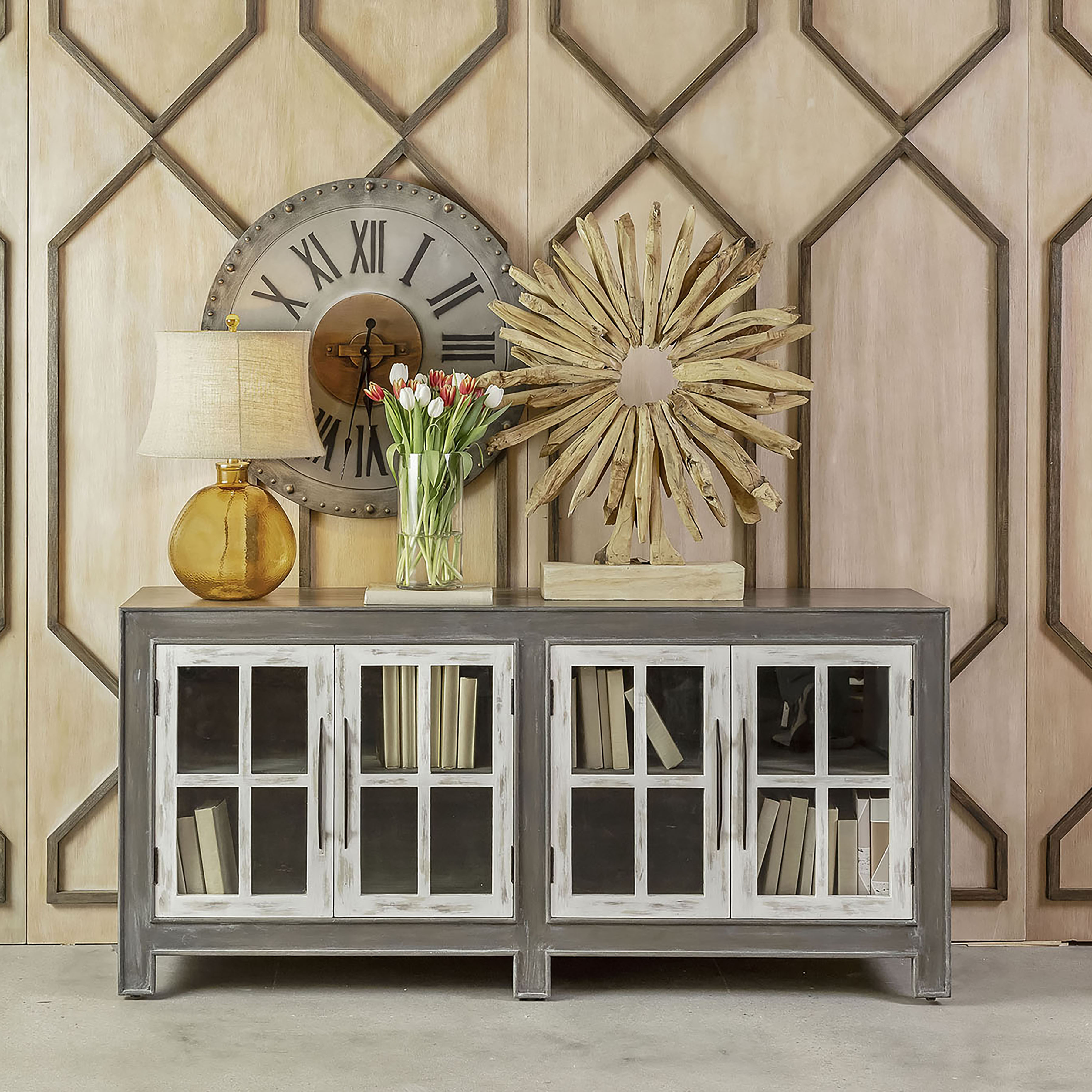 The Jack cabinet is an ideal way to add a country cottage touch to a transitional interior. This 4-door cabinet is built from plywood and mahogany in a Heritage Grey finish and features glass windowpane-style doors in whitewash. Its slim metal handles are custom made for this design. Two adjustable shelves help provide maximum storage.
