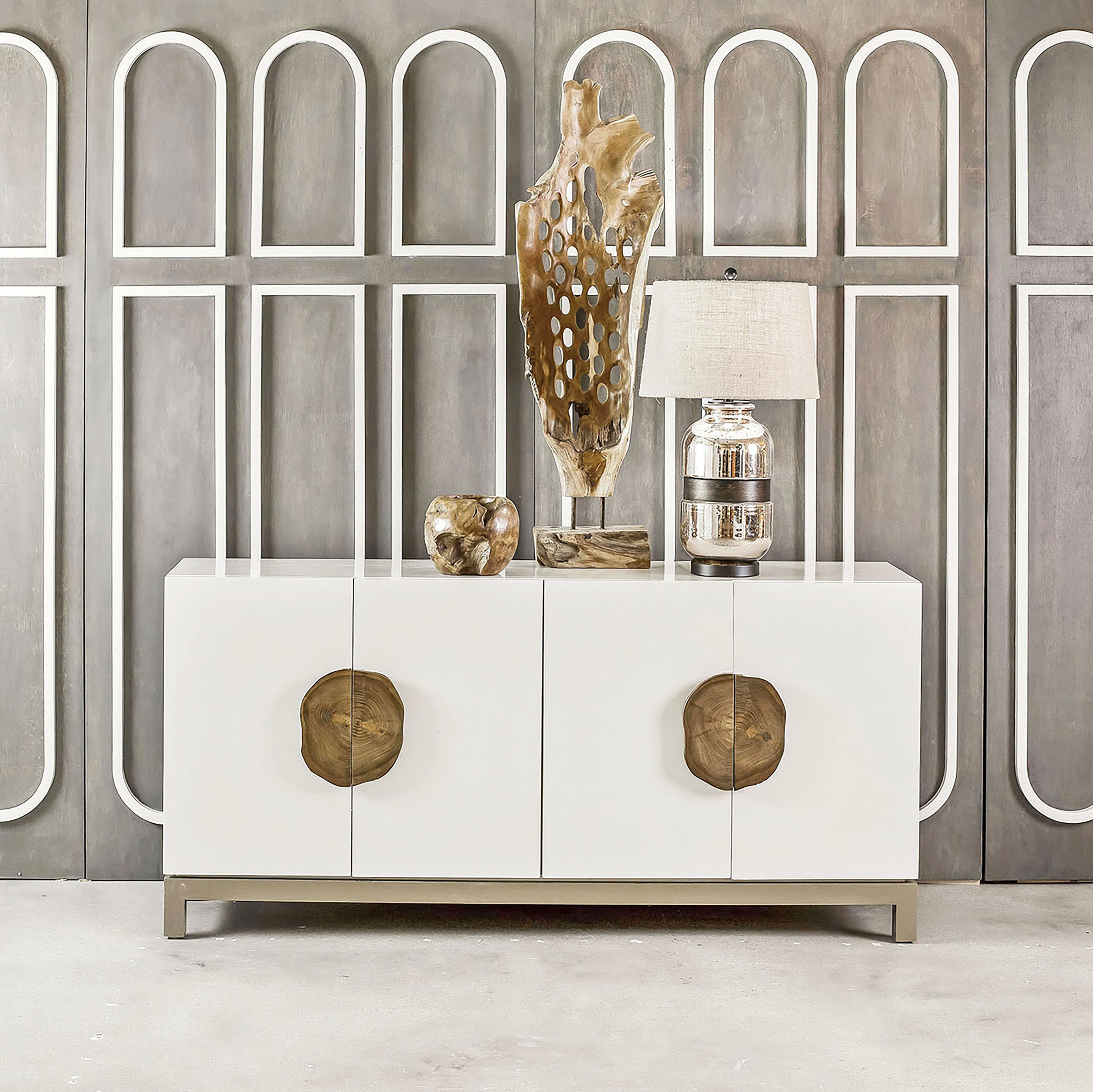 The Slice credenza gets its name from the sliced sections of teak that form the handles on its 4 doors. These pieces of stunning, natural timber display their beautiful and unique grain against the fresh, hand-applied white finish of the cabinet and are complemented by the soft Champaign Gold detailing on the supporting frame and legs. The Slice is an ideal piece for adding a subtle natural or coastal flavor to an interior, while providing discreet storage.