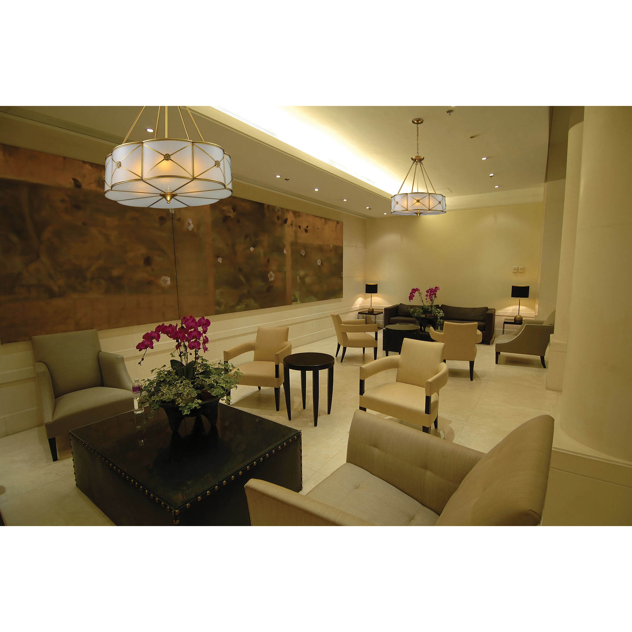 The English-inspired design of the Preston collection has solid brushed brass construction with curved frosted glass panels elegantly arranged around the perimeter. Each panel has a cast brass medallion at the center of each curved glass for a regal enhancement.
