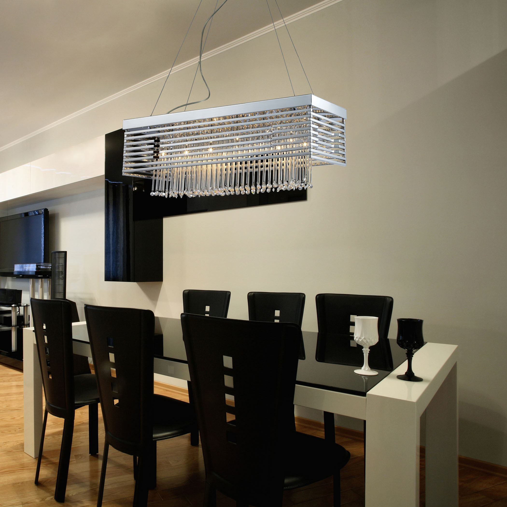 The Cortina chandelier creates an architectural crosshatch pattern utilizing horizontal polished chrome framework with slender glass rods arranged vertically for perfect symmetry. Its rectangular shape is especially suitable for kitchens and dining rooms.