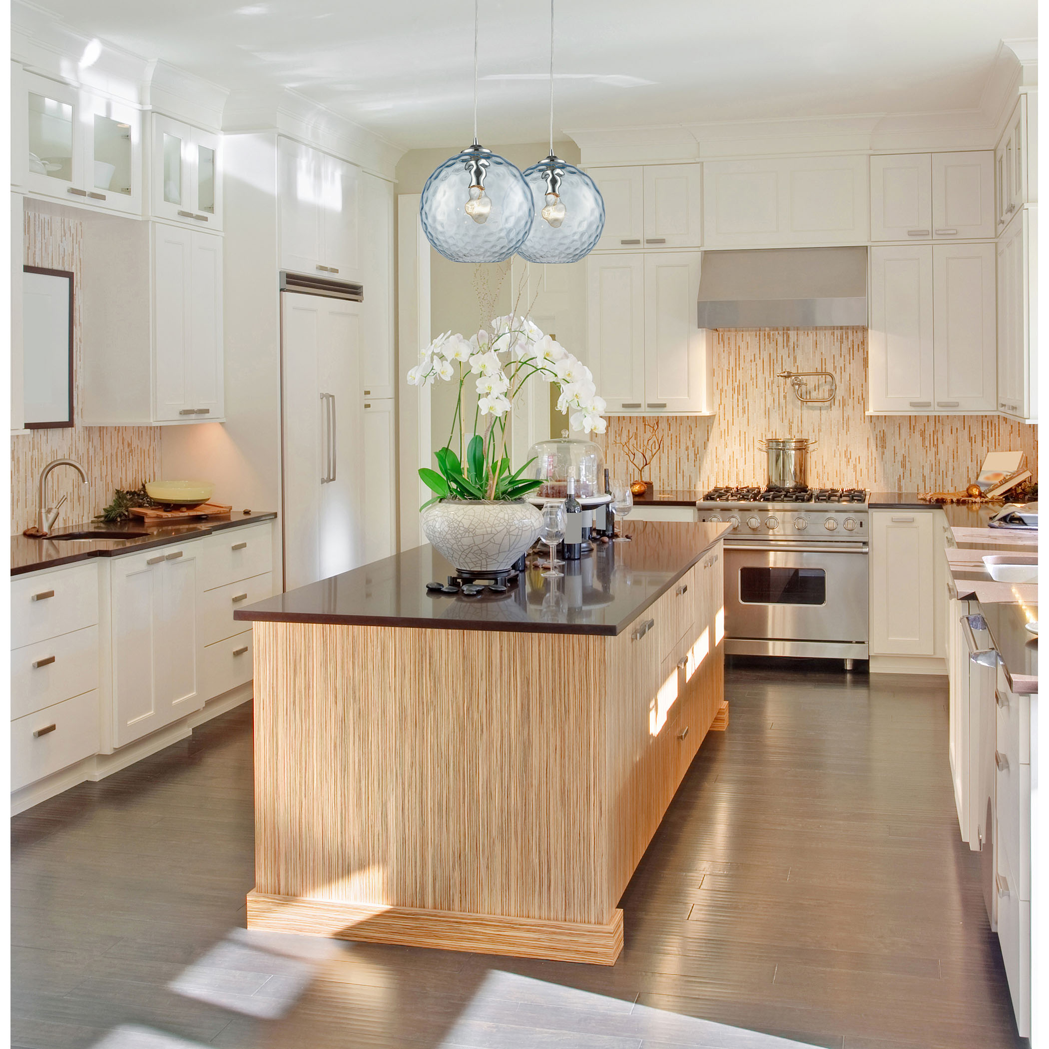 Blown water glass spheres are embellished with a spun center column. Finished in polished chrome with hammered glass in a variety of subtle color choices.