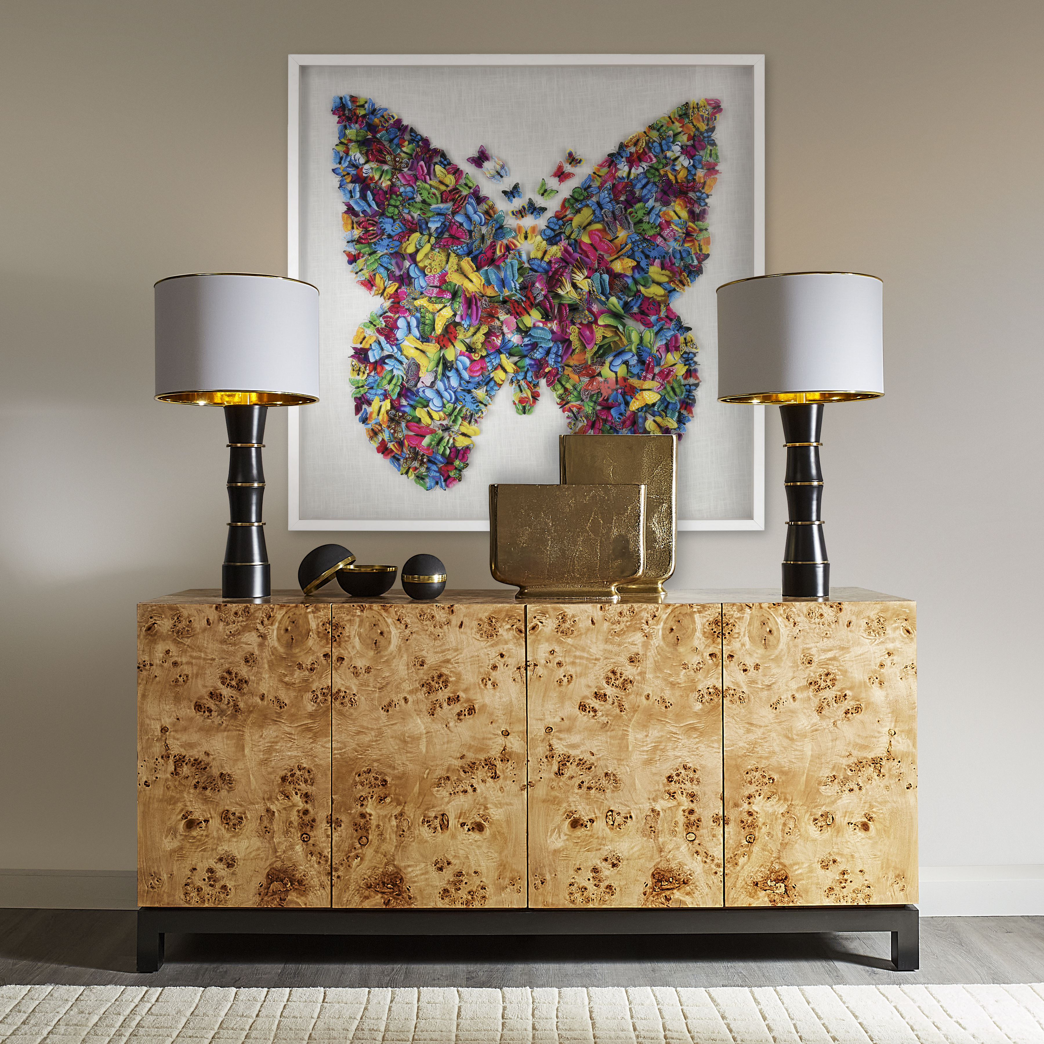 Butterfly Wall Décor is an oversize statement piece of dimensional wall art. 288 small colorful butterflies are collaged into a large butterfly shape and mounted on linen within a white frame.