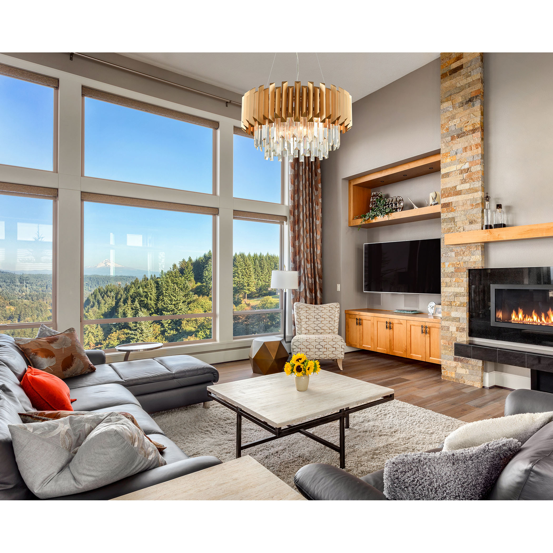 The Seneca Falls collection showcases a staggered metal ring, finished in Matte Gold, holding cascades of crystal prisms. The crystal is beautifully highlighted from the down light hidden behind the metal frame above.