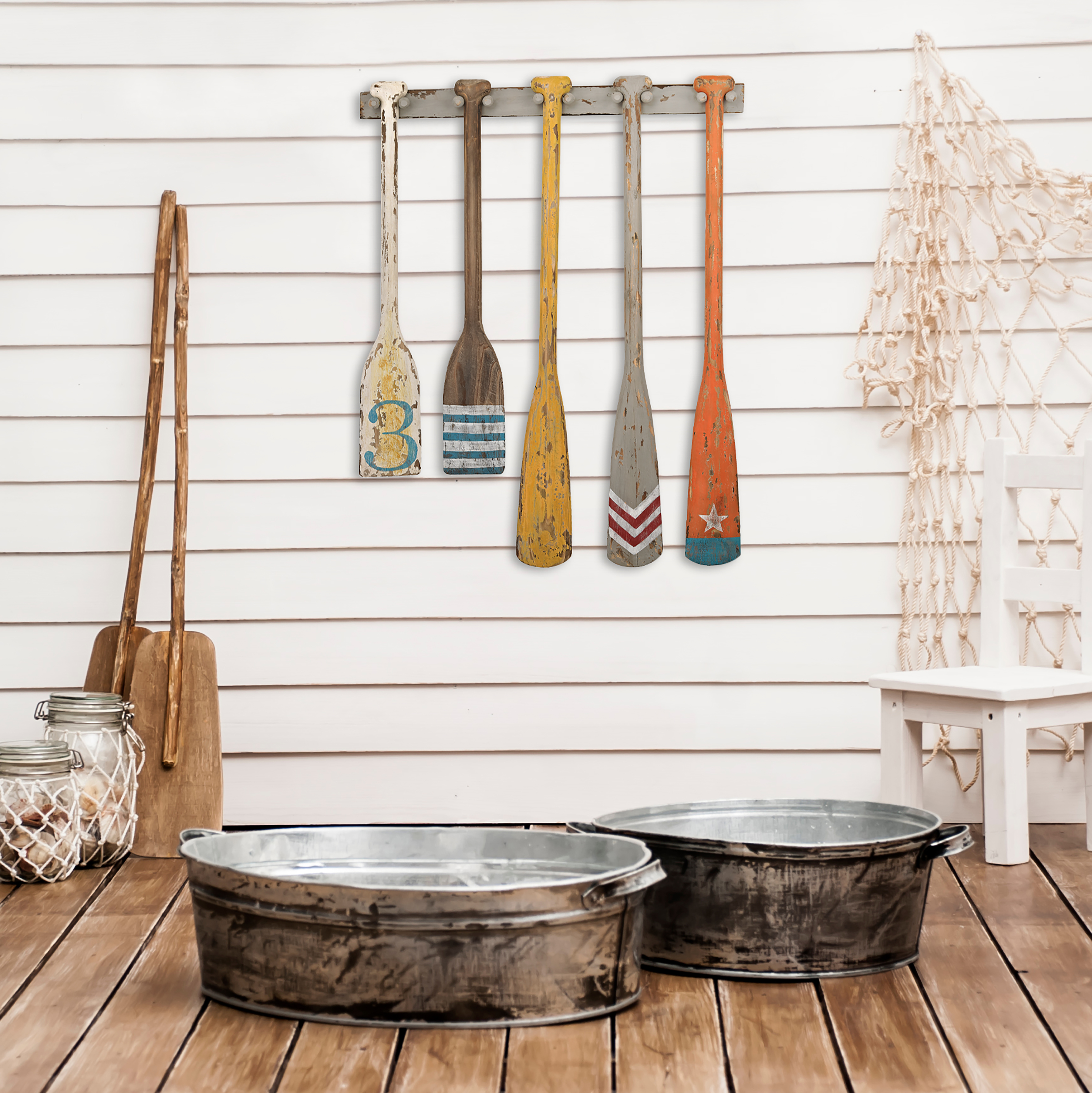 It's fascinating how lifestyle vignettes end up captivating our memories. Featuring brightly colored, hand painted designs with an uncanny used-for-generations appearance, the Summer Oars Wall Display captures the sun, sound and keen nostalgia of water-side living. Perfect for today's thematic mud and media rooms.