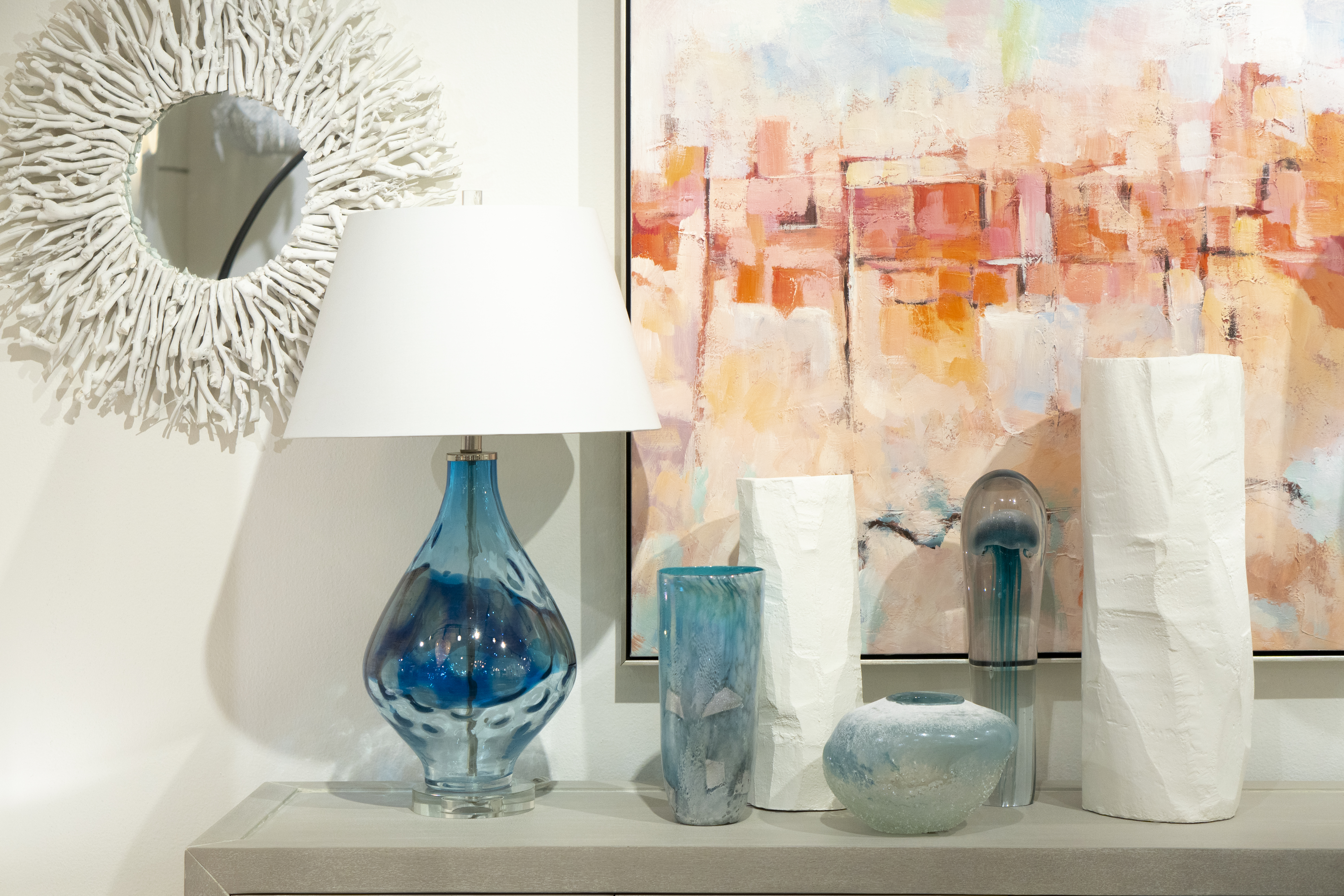 The Cay Glass Tabletop Sculpture is a long rounded cylinder of clear glass showing an inner orb of aqua blown glass reminiscent of a jellyfish surrounded by clear glass.