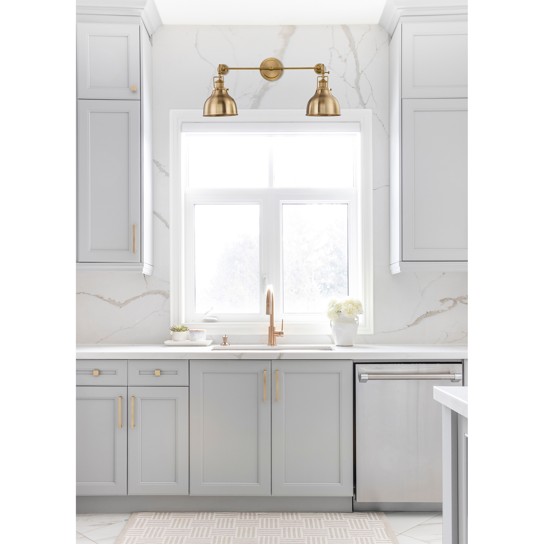 The Skillet 2-light wall sconce has been designed with versatility, ideal for lighting shelves, counter top areas, and vanities. Vintage detailing adds a farmhouse inspired look. Finished in Burnished Brass.
