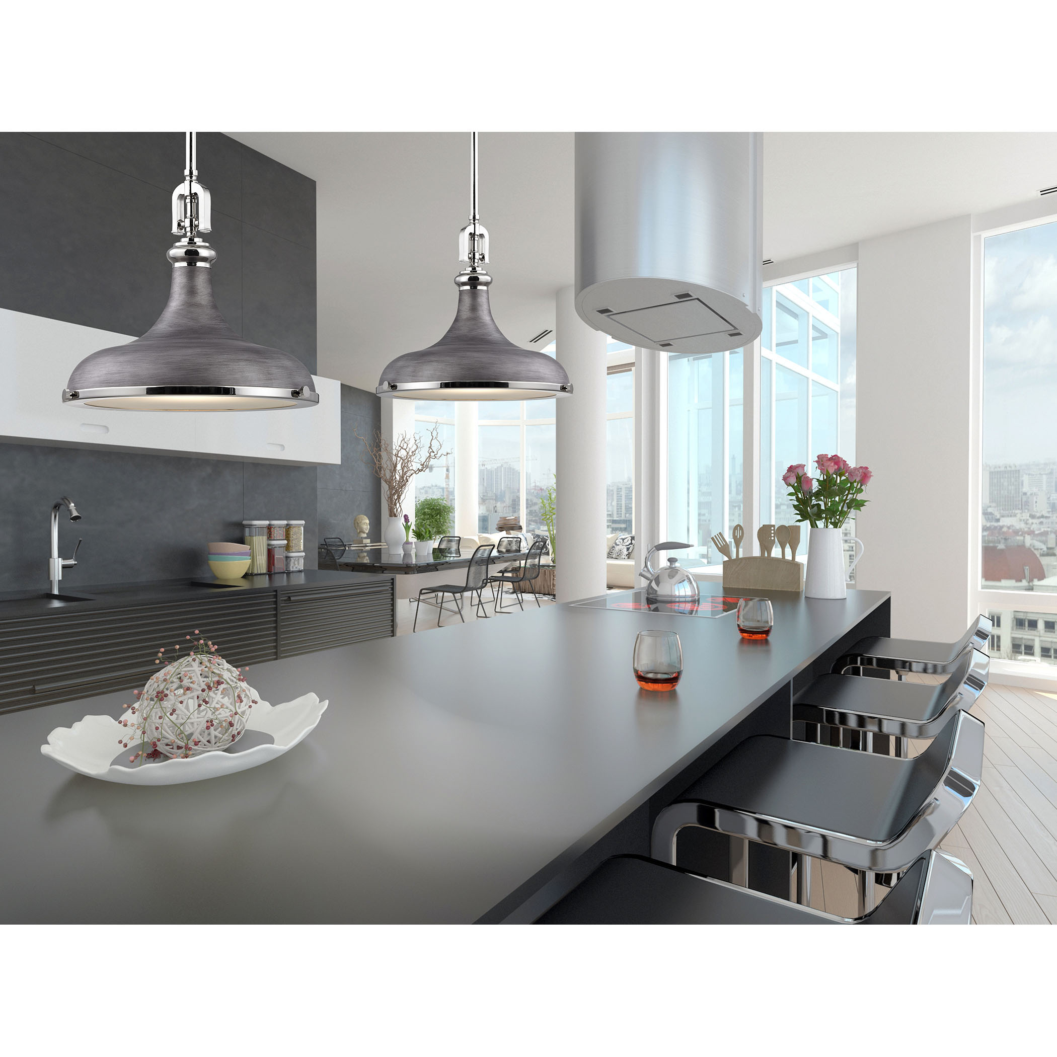 This series has a smooth curving profile adorned with a decorative link casting adding to the restoration appeal of these designer pendants. The edge of the metal shade is defined by a ring that has period-authentic thumbscrews and a frosted glass diffuser. Finishes include Polished Nickel, Polished Nickel/Gloss white, Brushed Nickel, Oil Rubbed Bronze, Polished Nickel/Weathered Zinc, Brushed Antique Brass/Oil Rubbed Bronze and Satin Brass.
