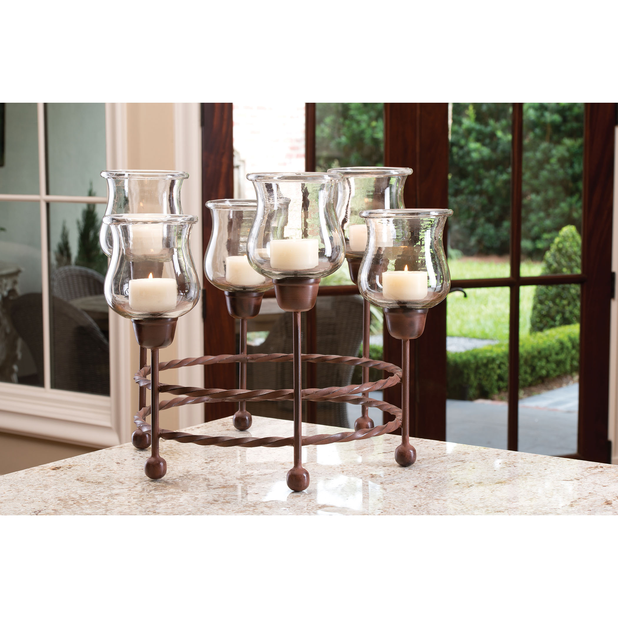 The Rodeo Candleholder is made from a round rustic metal base which displays upright 6 stands, equally spaced apart. Atop of these stands are bell shaped clear glass hurricanes. It makes for a great centerpiece.