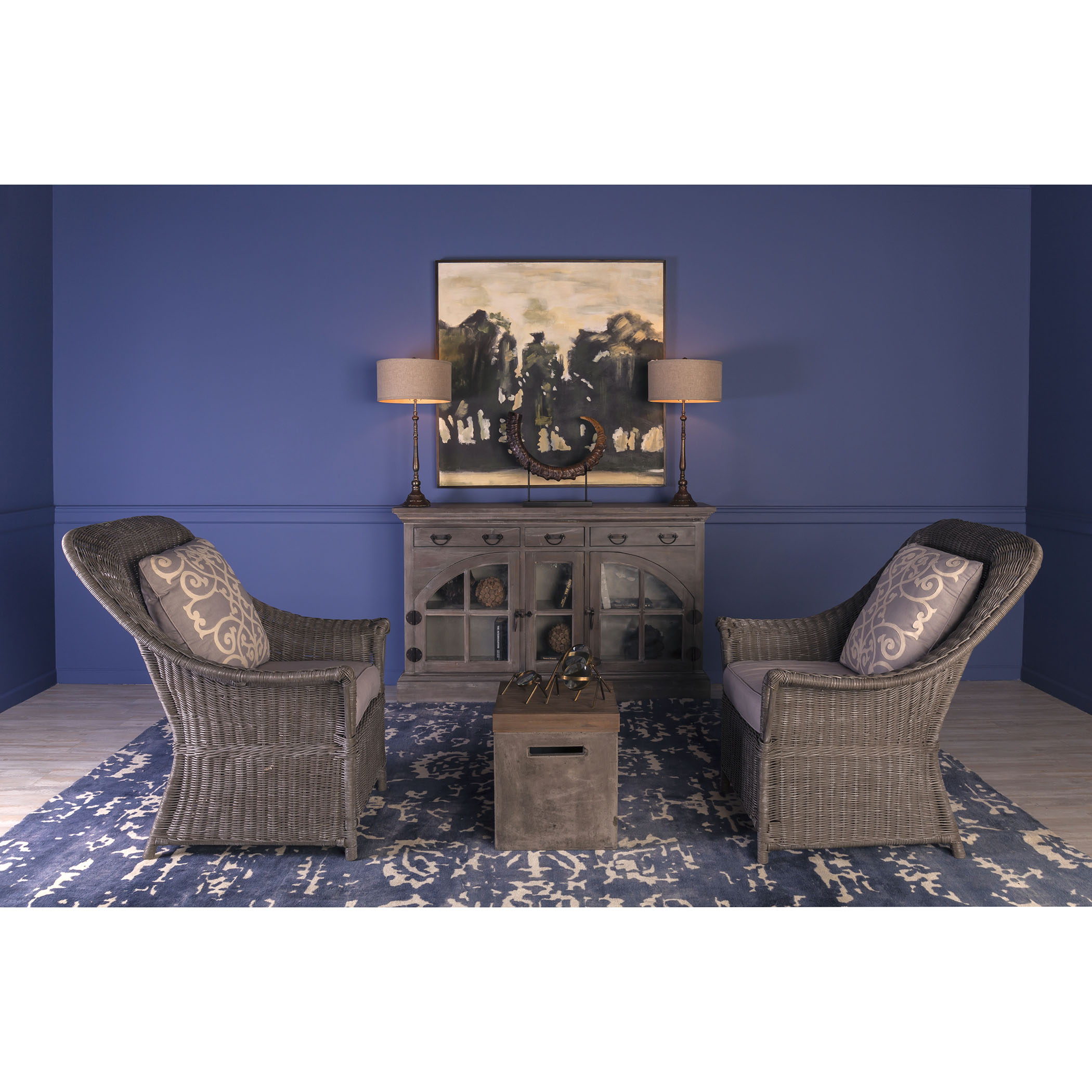 The Farmhouse Credenza is a rustic storage piece with a tall, shallow scale with three glass paneled doors and three doors. This piece offers optimal storage for a dining room.