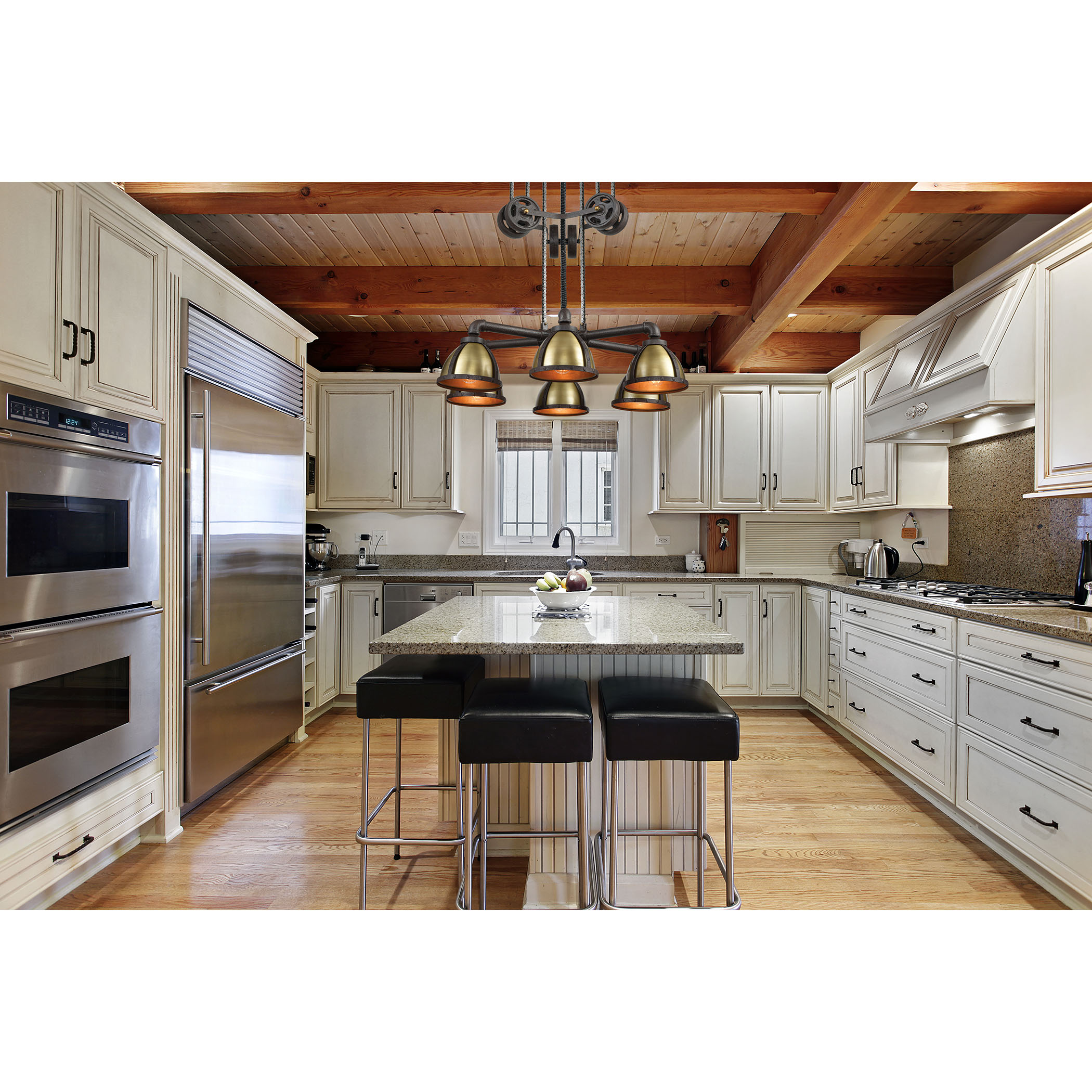 The Torque pulldown fixtures have an oversized, industrial-inspired design. Using heavy duty gear chain, this item can be moved up or down with cast iron wheel counter weights and gears as the mechanisms for movement. The gears and metal shades are finished in Vintage Brass, which accents the Vintage Rust finished metalwork.
