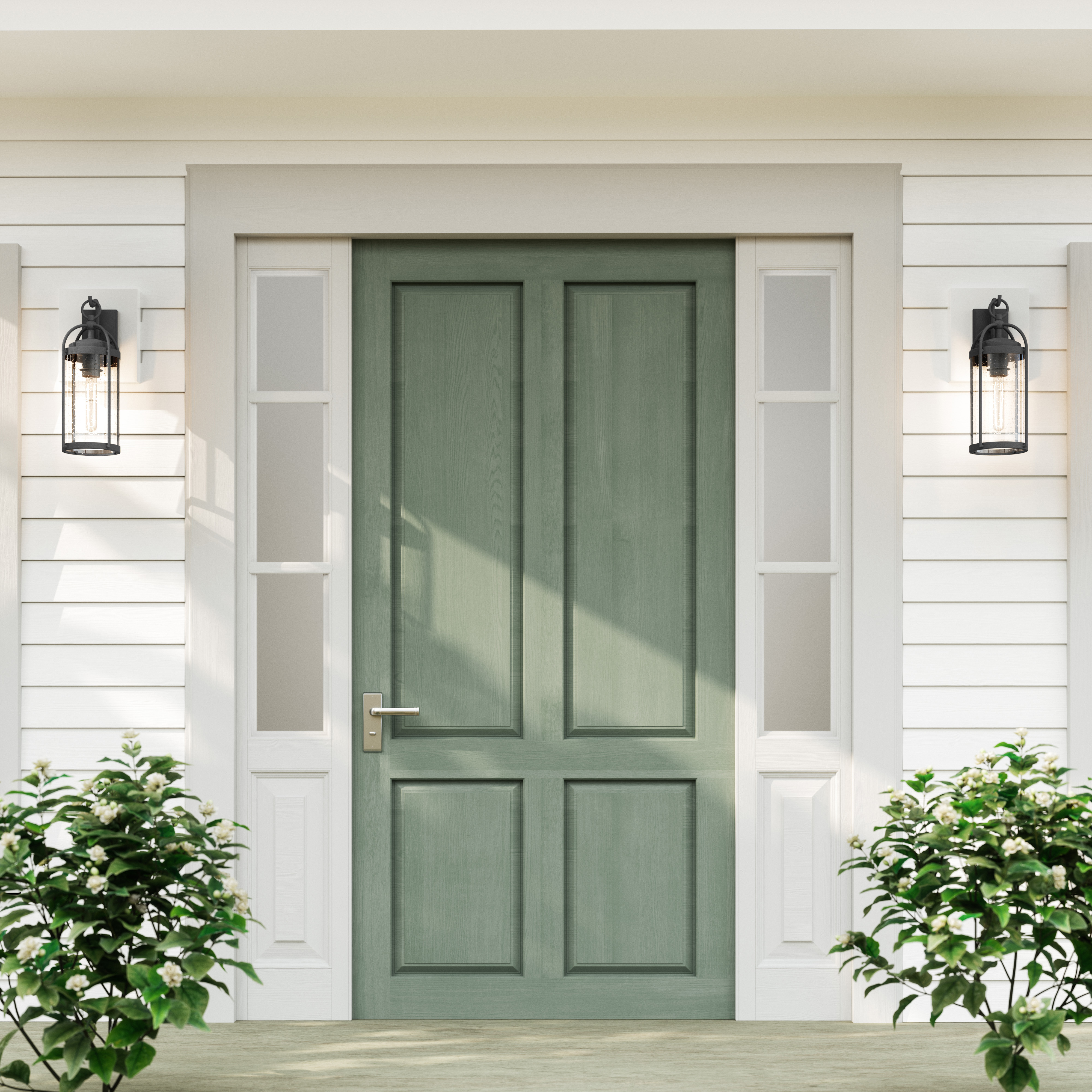 The Catalonia outdoor collection has a cylindrical designed metal cage surrounding seeded glass. A hook and loop detail adds a quaint historic charm.