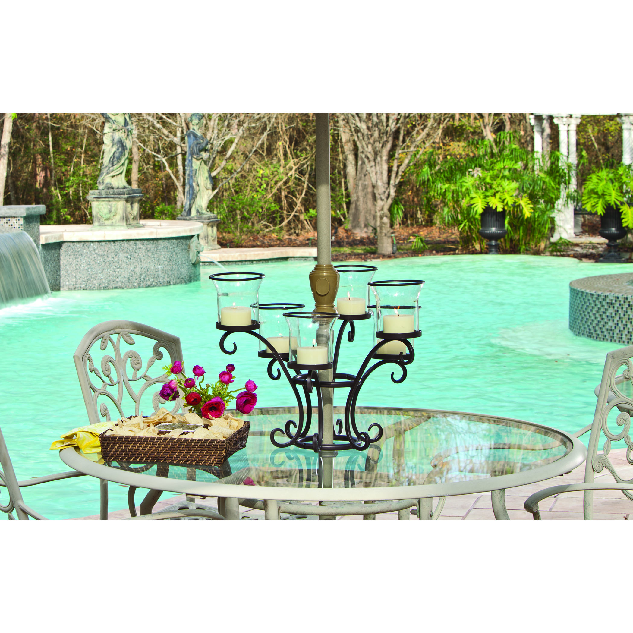 The Chelsea Outdoor Candleholder is made from a round rustic metal base which displays upright 6 stands, equally spaced apart. Atop of these stands are bell shaped clear glass hurricanes. Accented by curvy metalwork, it makes for a great centerpiece.
