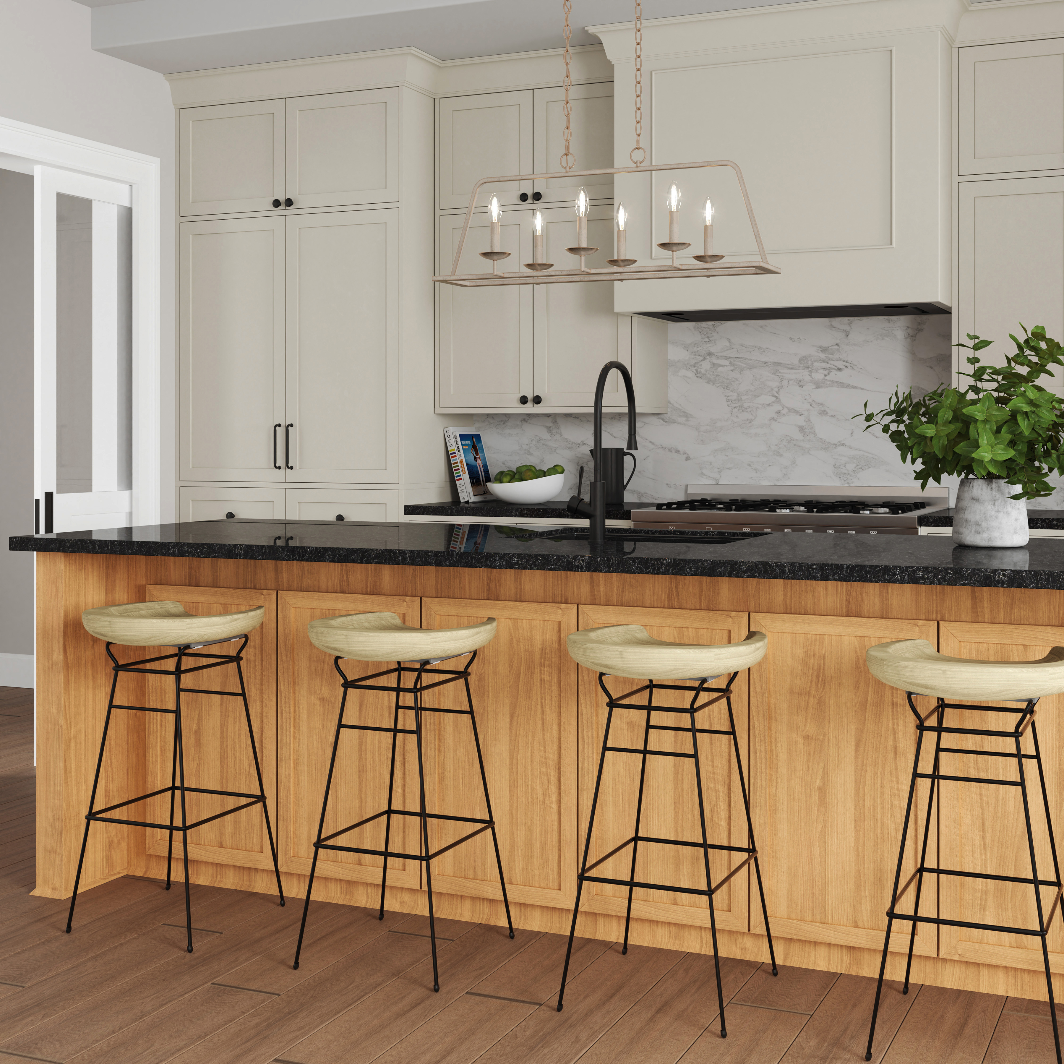 The Joanie Island Light makes a bold statement. An open metal lantern-style frame surrounds two rows of candles, six in total. Display this linear chandelier over a kitchen island, dining table or game table for maximum impact.