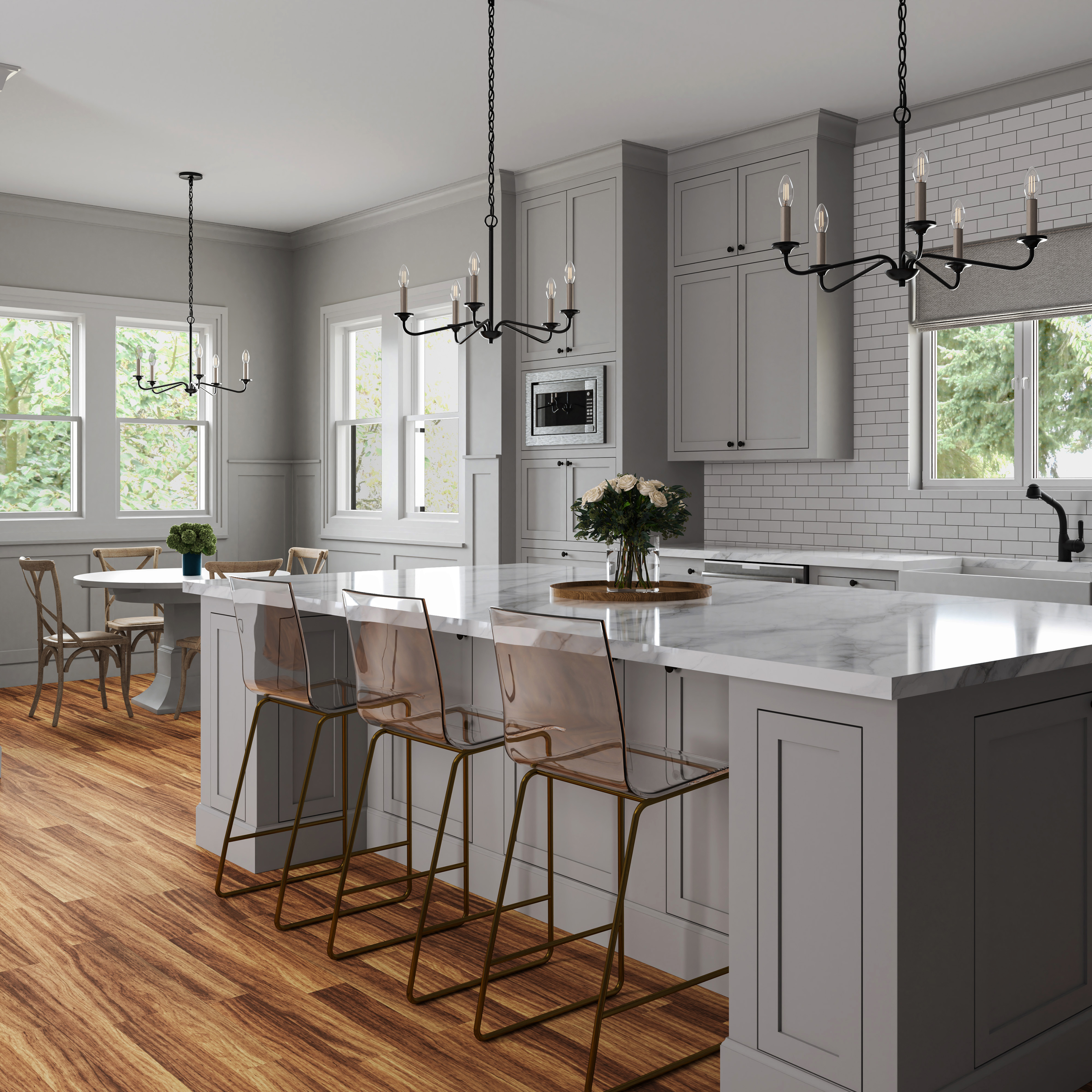 The Quinn Chandelier is a chic and simple curved 5-light chandelier. Five arms curve elegantly from a central rod, each supporting a single candle and a faux birch candle cover. The look is an updated, pared-down take on a traditional silhouette.