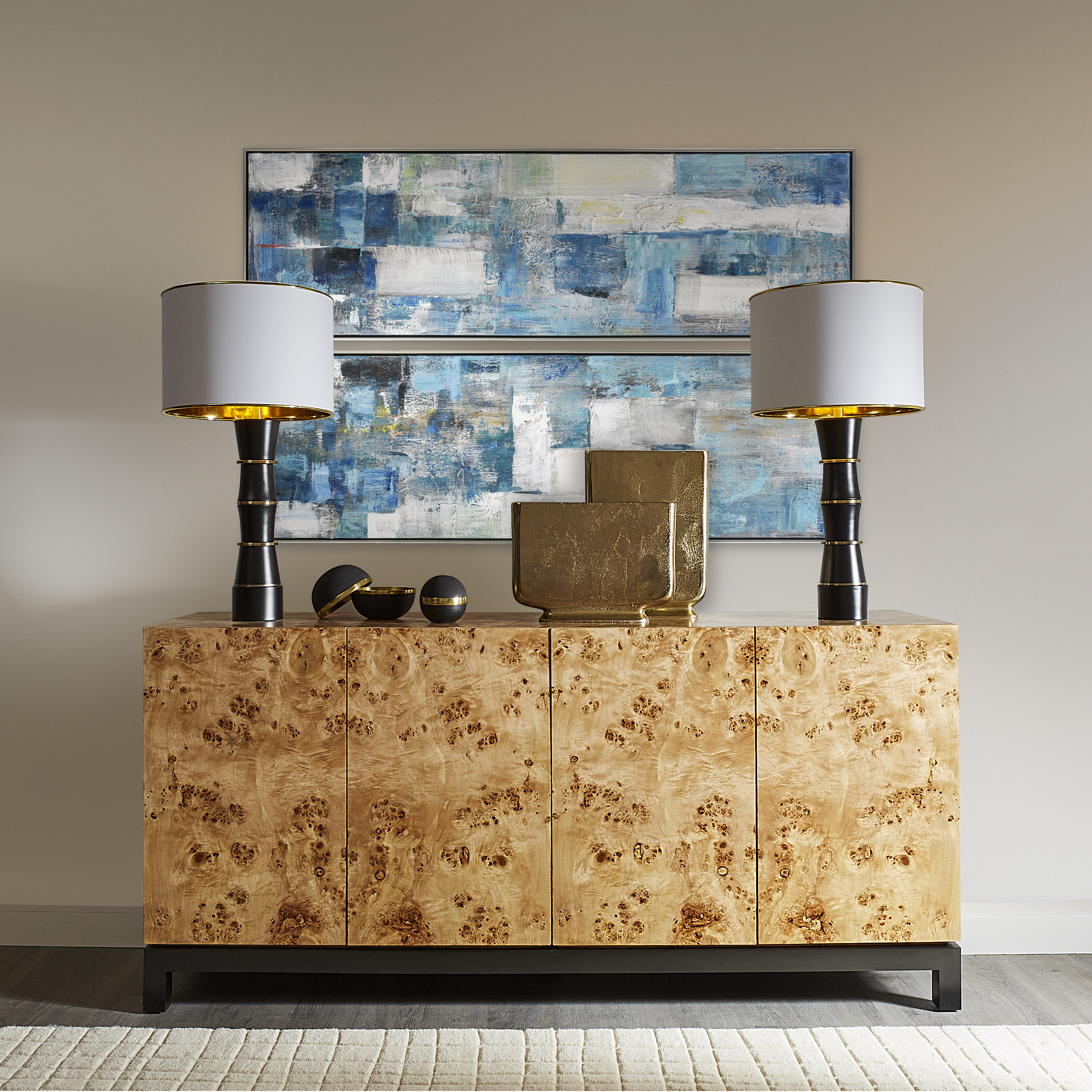 Broad brush strokes in blues and white create an intricate patchwork of color and texture in Blue Apparent. This two-piece set is hand painted on canvas and comes in a silver floating frame. These panels are ideal for adding a pop of vibrant color and dimension to a modern space and feature hints of gold highlights.