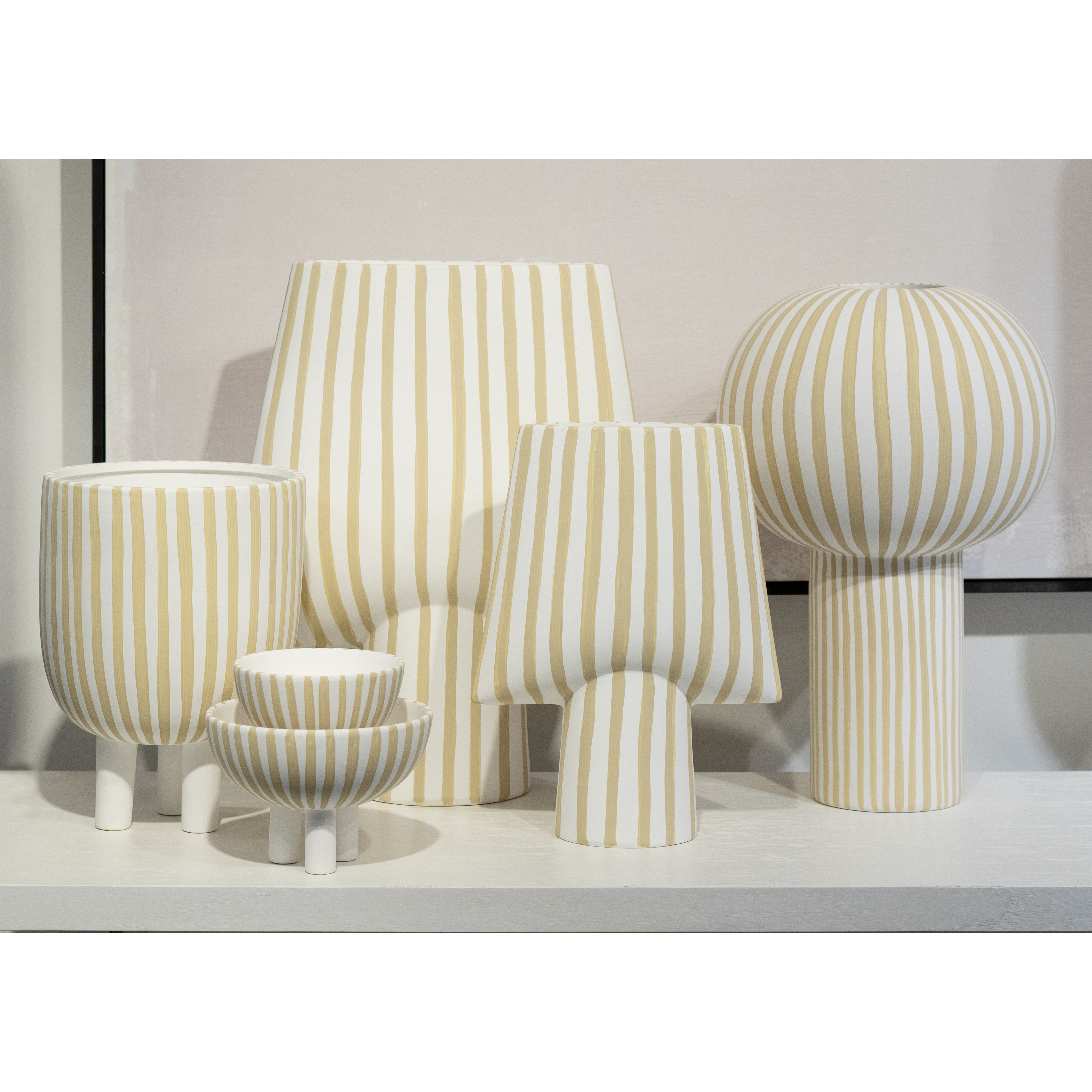 The Hawking Extra Large Vase has a cylindrical base topped with a rounded body that is wide and flat. The earthenware vase has a white and taupe striped painted finish and a sculptural, playful aesthetic.
