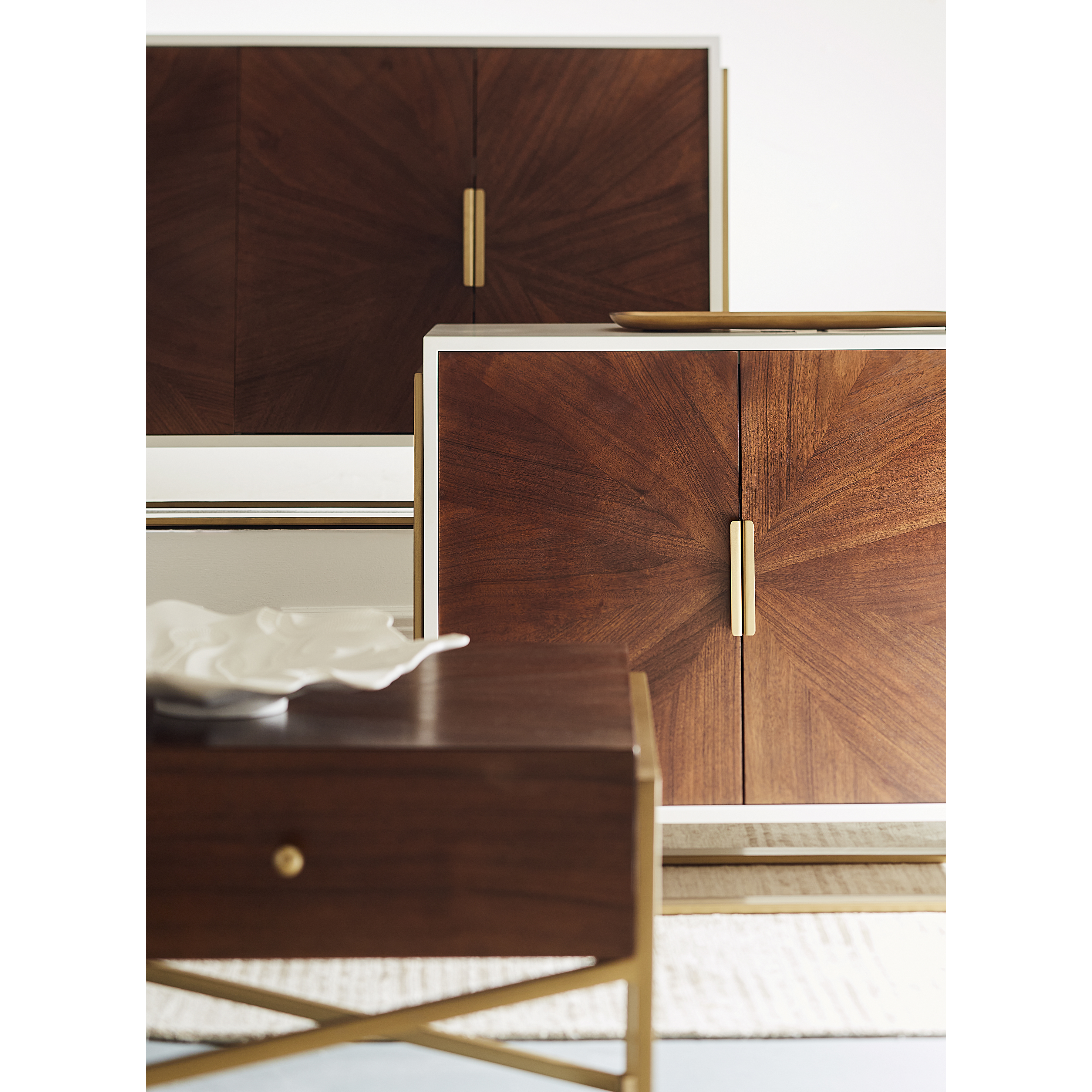 The Guilford Coffee Table is a stylish rectangular wood coffee table with two drawers made from acacia wood veneer in a warm mahogany finish. The tabletop connects to metal legs and a crisscrossing framing bar in a brass tone finish.