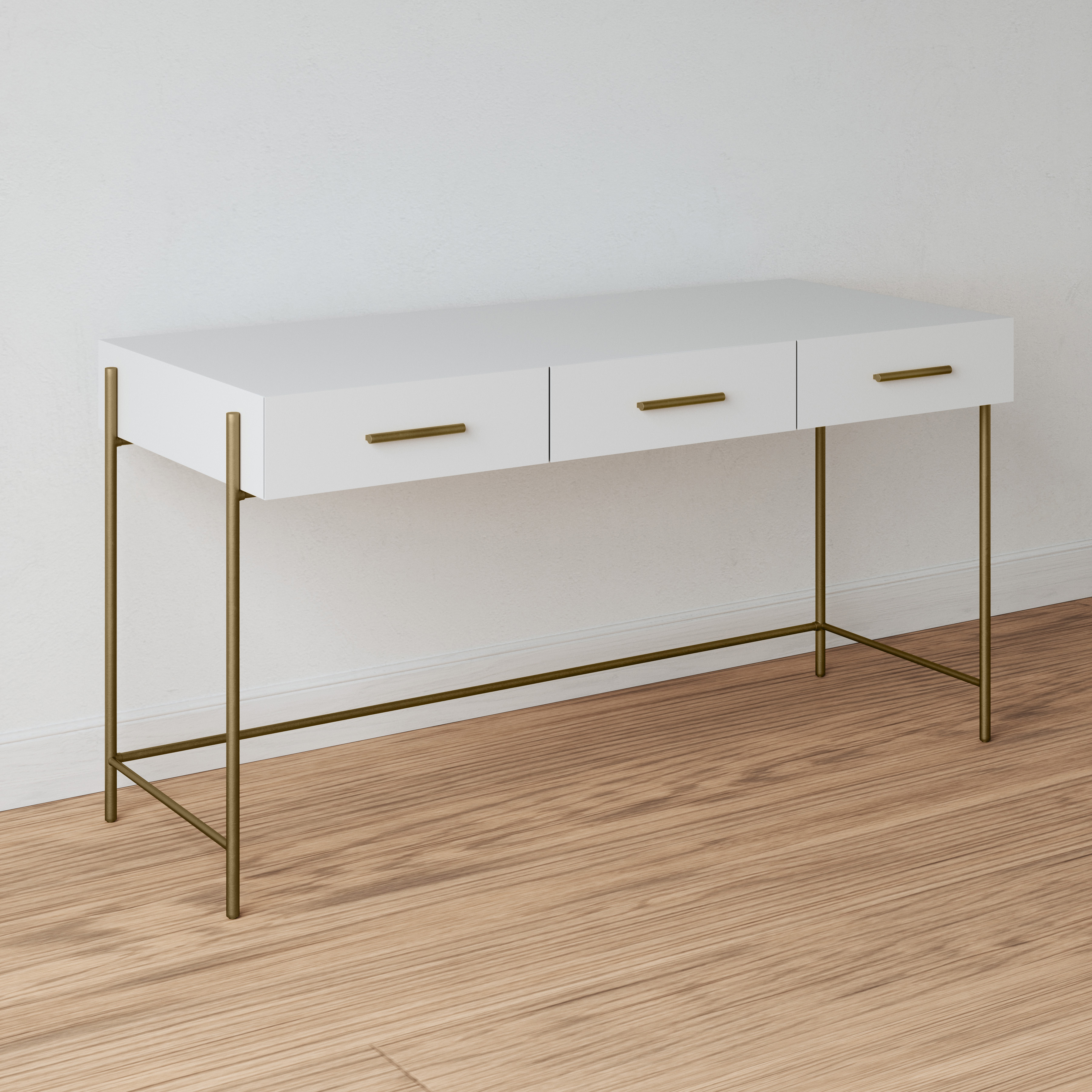 The Walker Desk is a stylish rectangular white desk with three drawers. The desk has a metal base finished in antique brass. This piece is ideal in a contemporary or coastal inspired living room or home office.