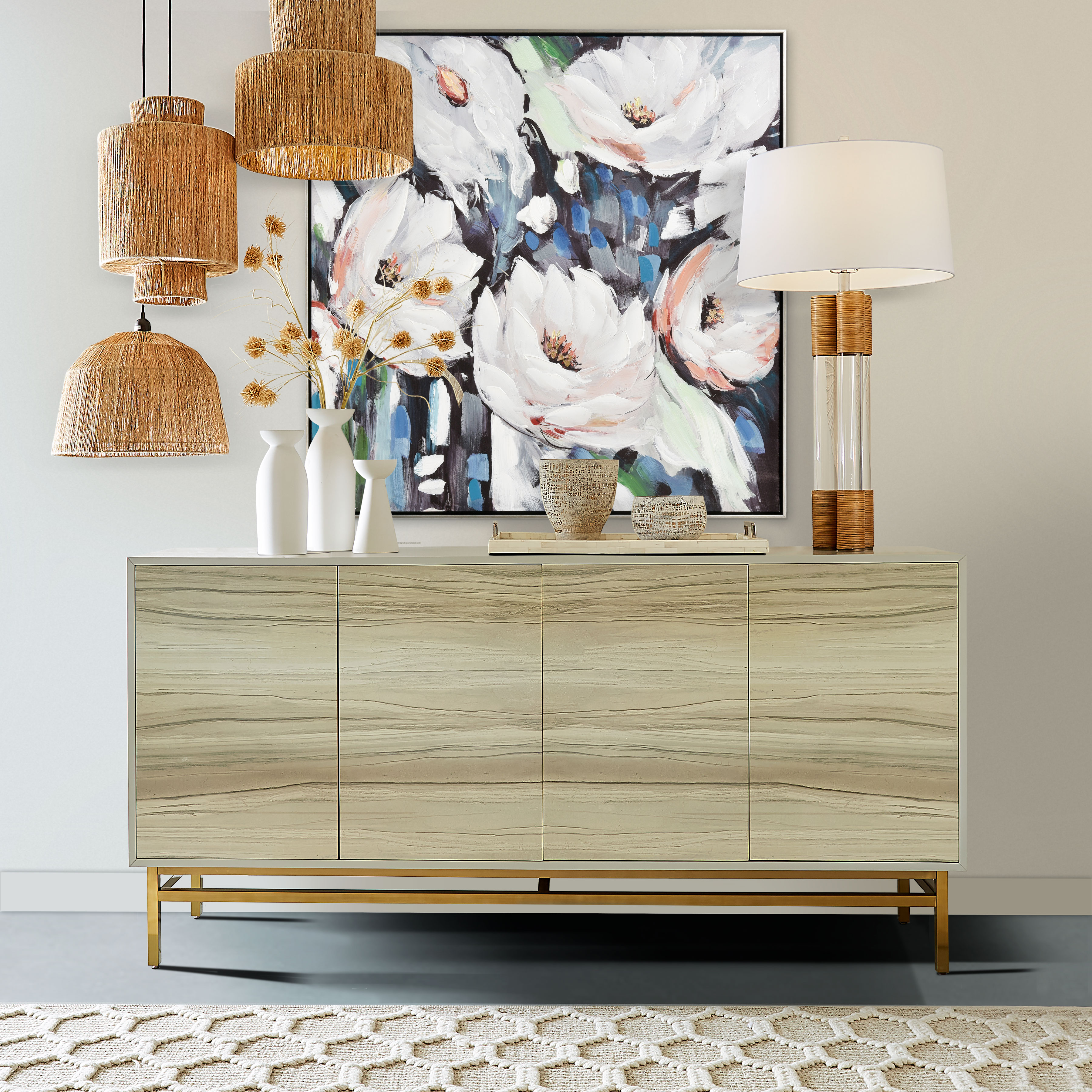 With botanical elements remaining a strong, style conscious choice, the Spring Still Life wall art offers a delightful way to add a splash of color to a bedroom or living room. Captured in vibrant greens, blues and blush pink, this design creates a beautiful and timeless accent. This hand-painted acrylic features a floating frame in a champagne finish.