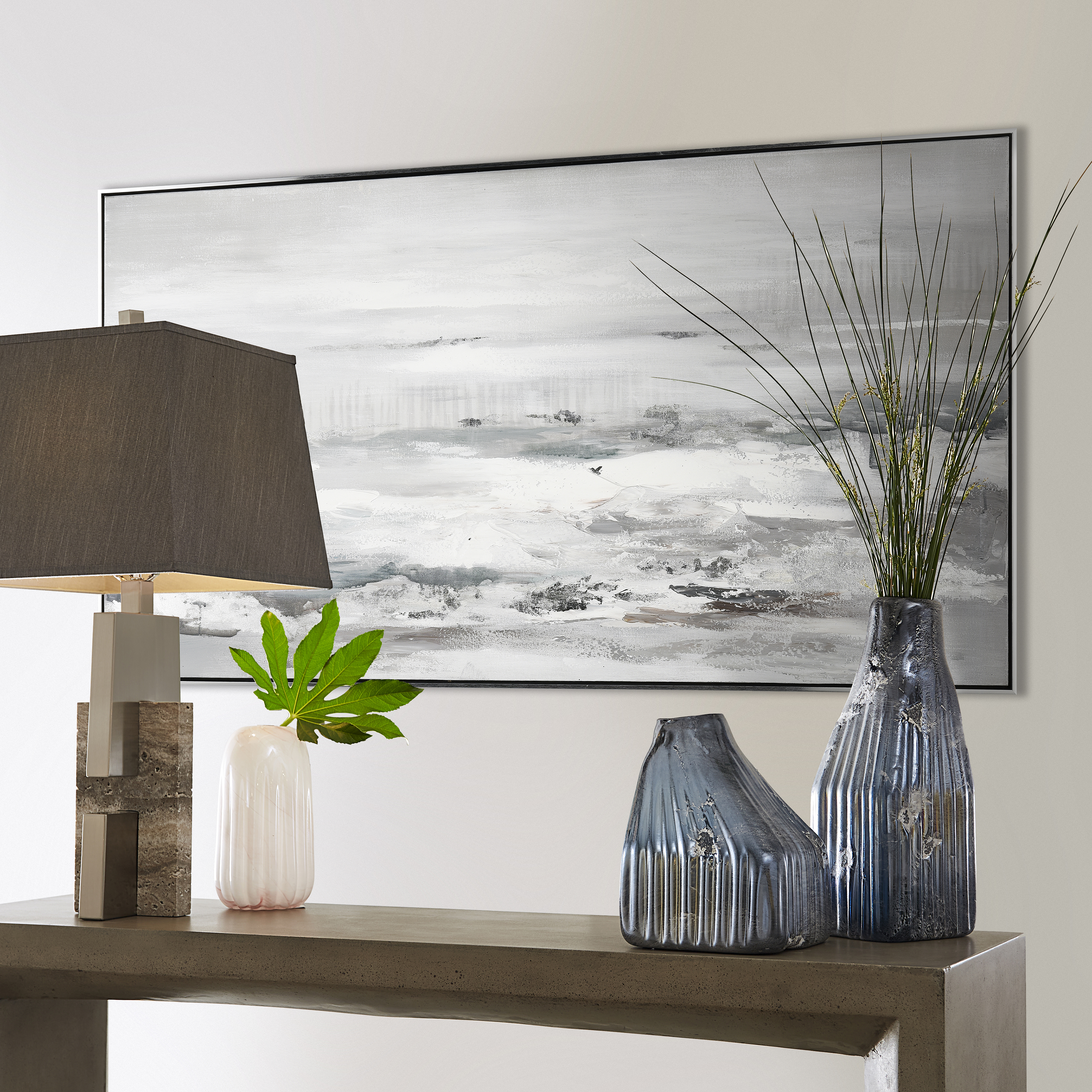 Perfect for adding a sense of motion to a modern or coastal style space, Renew is an abstract waterscape that displays the churning blues, grays and whites of a tide on the turn. This design is finished by hand in heavily textured acrylic paint and comes presented in a silver floating frame.