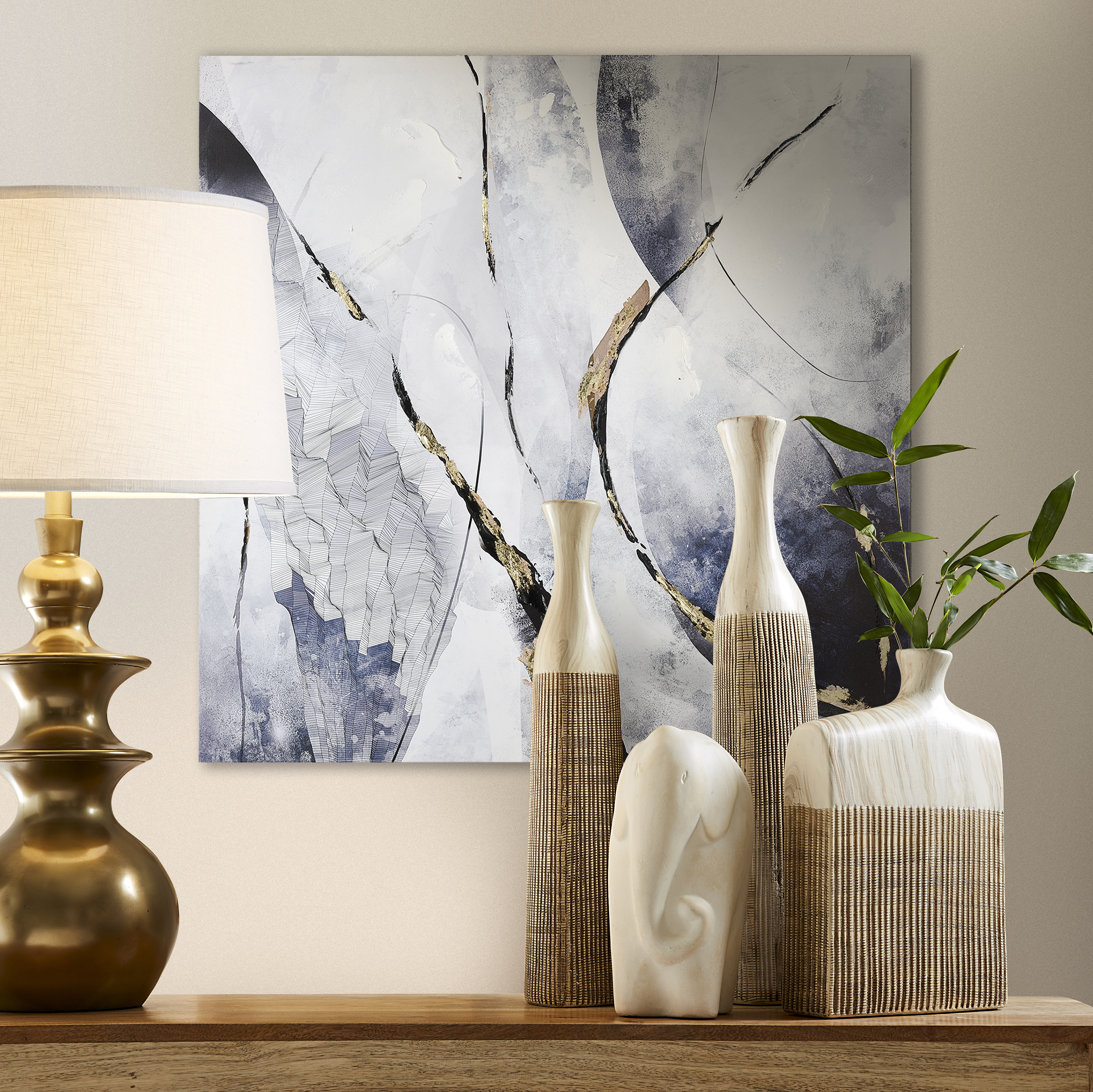 Abstract, dynamic lines form the basis of Strength. Captured in rich blues and grays, this color print on canvas is finished by hand in acrylic paint with gold leaf accents. This piece is ideal for adding texture and interest to a contemporary style room. Display this piece with Power from the same series for maximum effect.