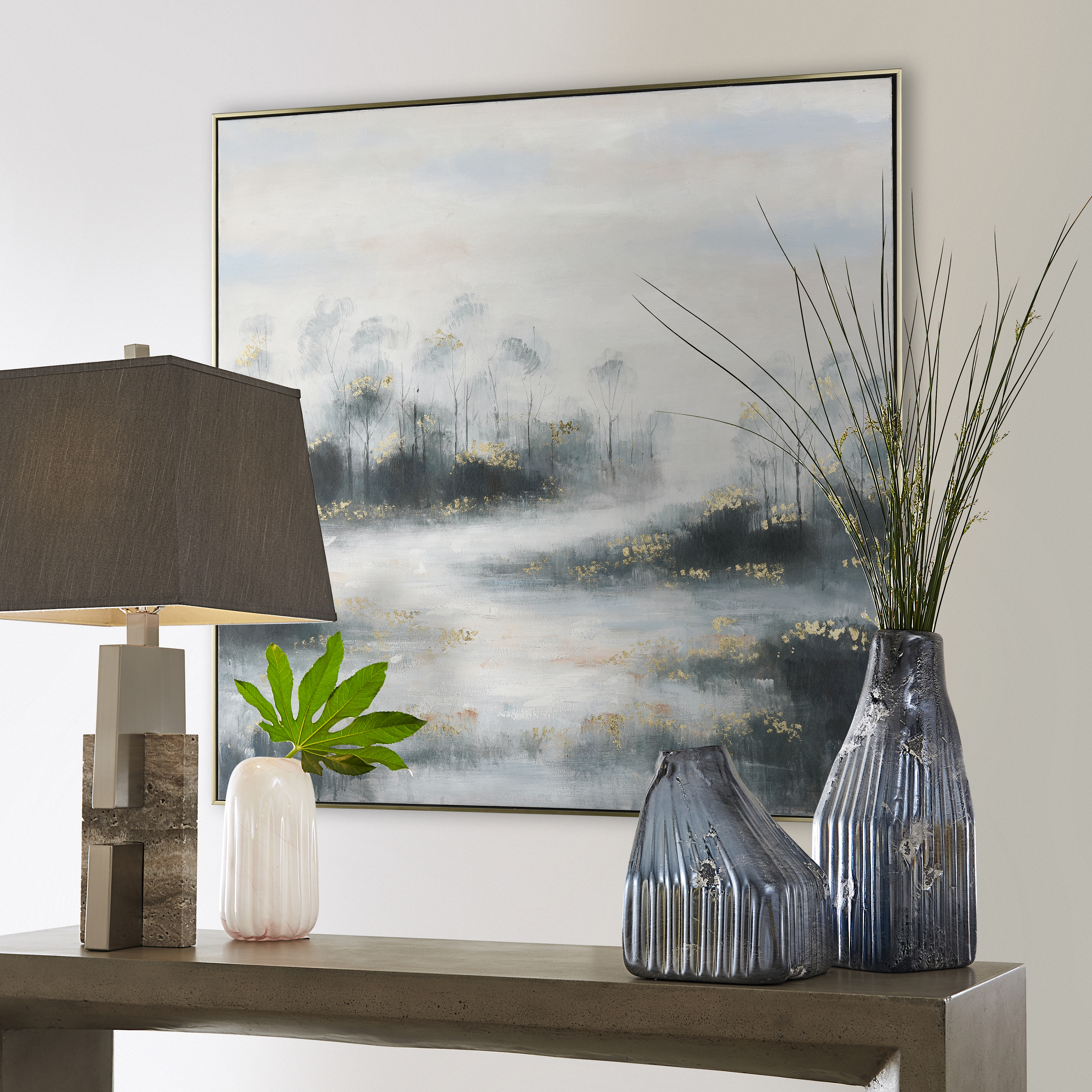 River Mist is an impressionistic style hand-painted acrylic on canvas depicting a river with tree lined banks. The soft, atmospheric quality of early morning mist hanging over the water is captured in subtle hues of gray and white and features highlights in metallic gold to suggest the sunrise is on its way. This piece is perfect for adding a natural element to a living room, hallway or study. The canvas is finished with a floating gold frame.