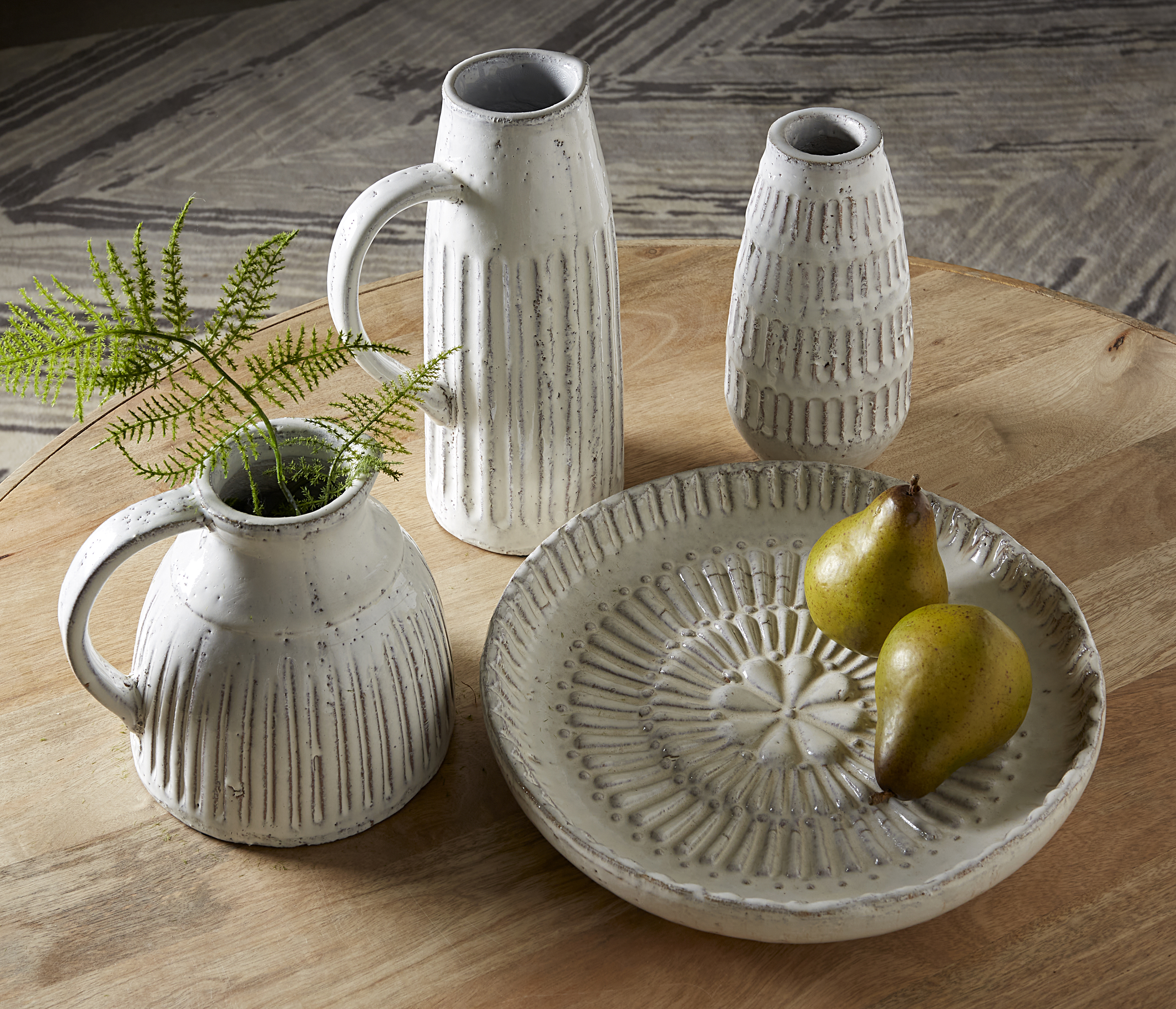 The Muriel large terracotta vase brings a subtle, rustic style to a side table or console. This textured piece features an aged finish in white. This design is perfect for a country farmhouse, or coastal style room.