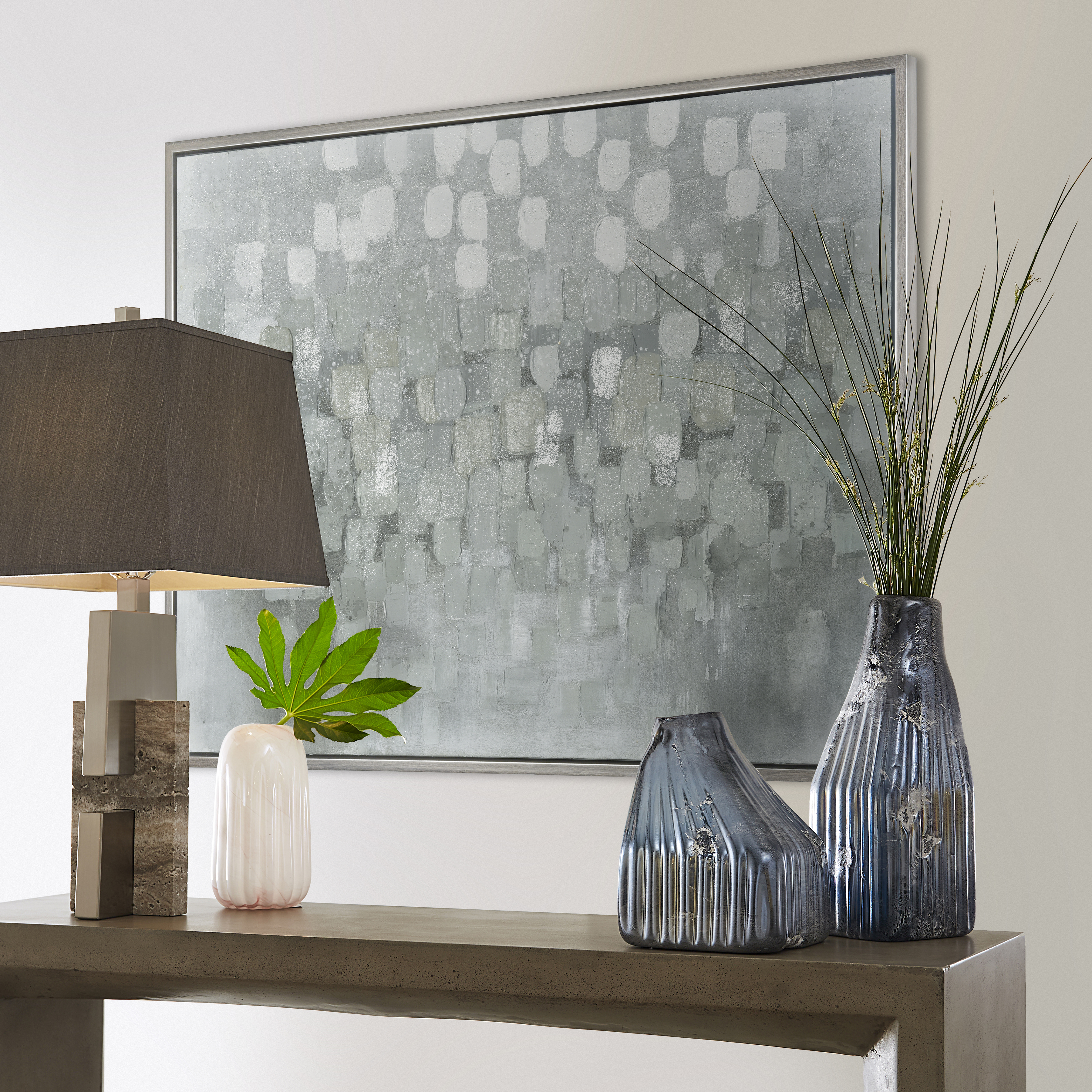 Buck Rain Framed Wall Art is an abstract painting featuring brushstrokes of grey, which shift from light to dark and appear out of focus, like viewing the water through a window in the rain. This piece comes ready to hang with a thin silver painted frame.