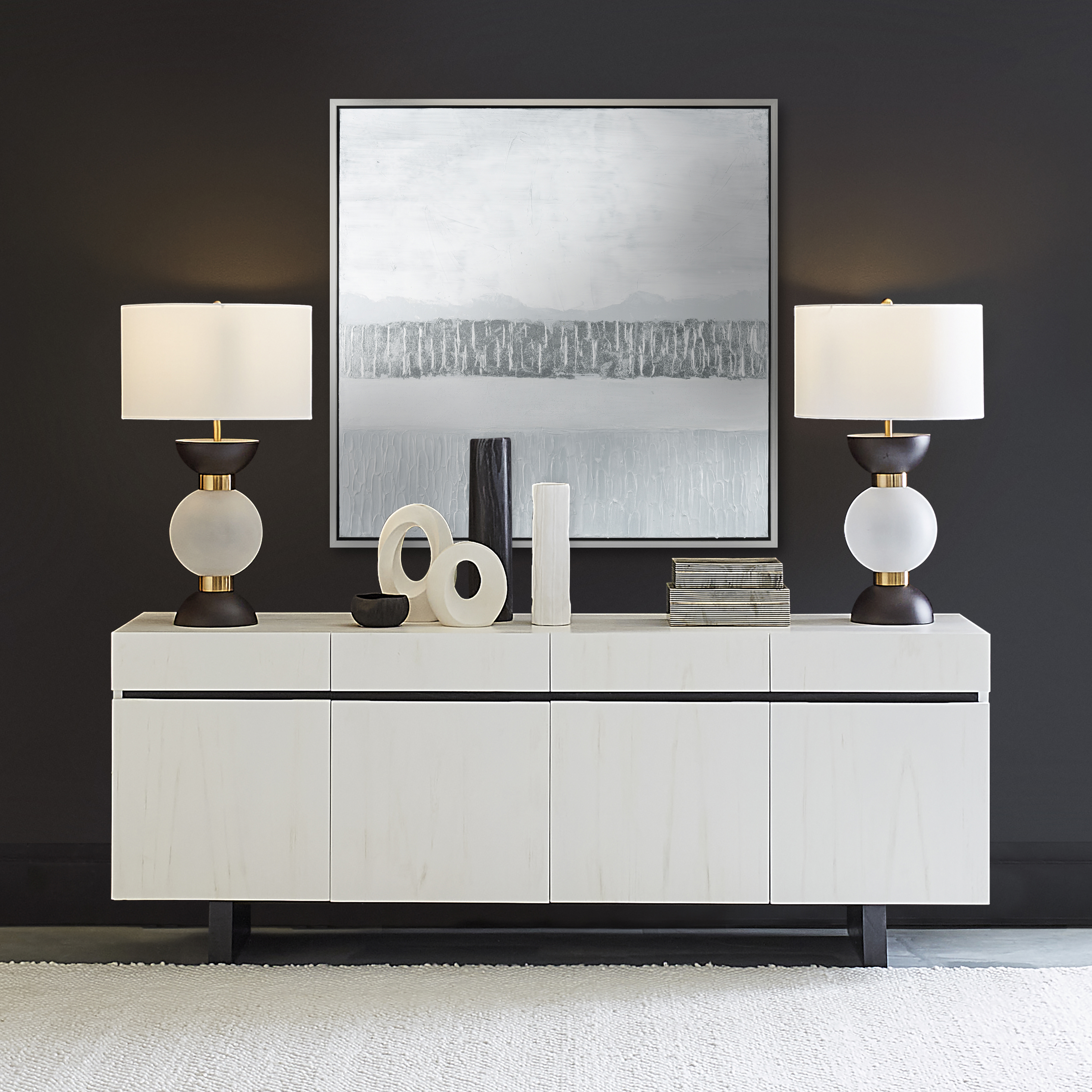 Weber Lake Framed Wall Art is an abstract study in muted greys. A central textured horizontal silver line draws the eye, and brushstrokes create an ombre effect that extends from the center point. This piece comes ready to hang with a thin silver painted frame.