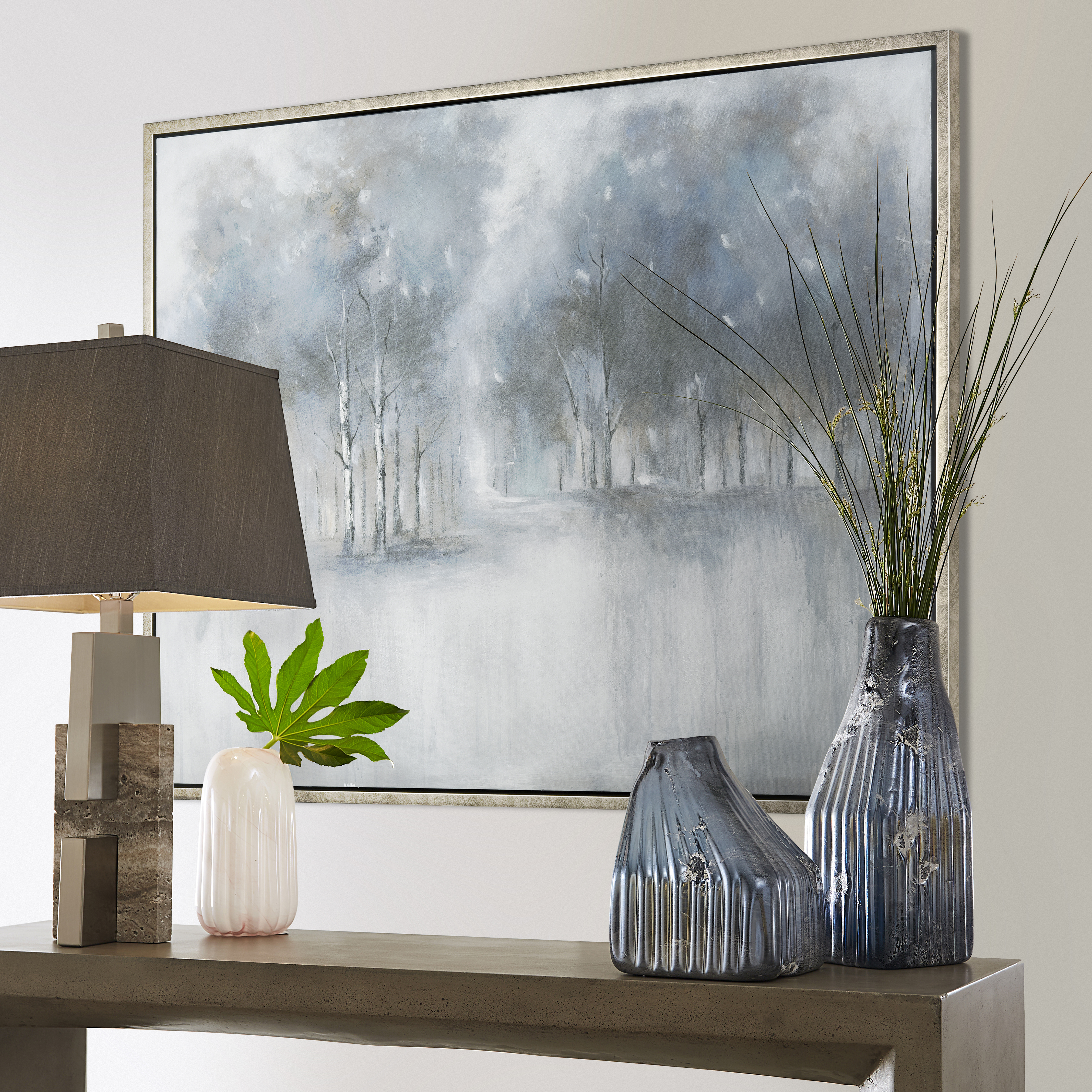 Muller Forest Framed Wall Art is an abstract expressionist painting of a shadowy forest, told through muted brushstrokes in black and white. This piece comes ready to hang with a thin painted frame.