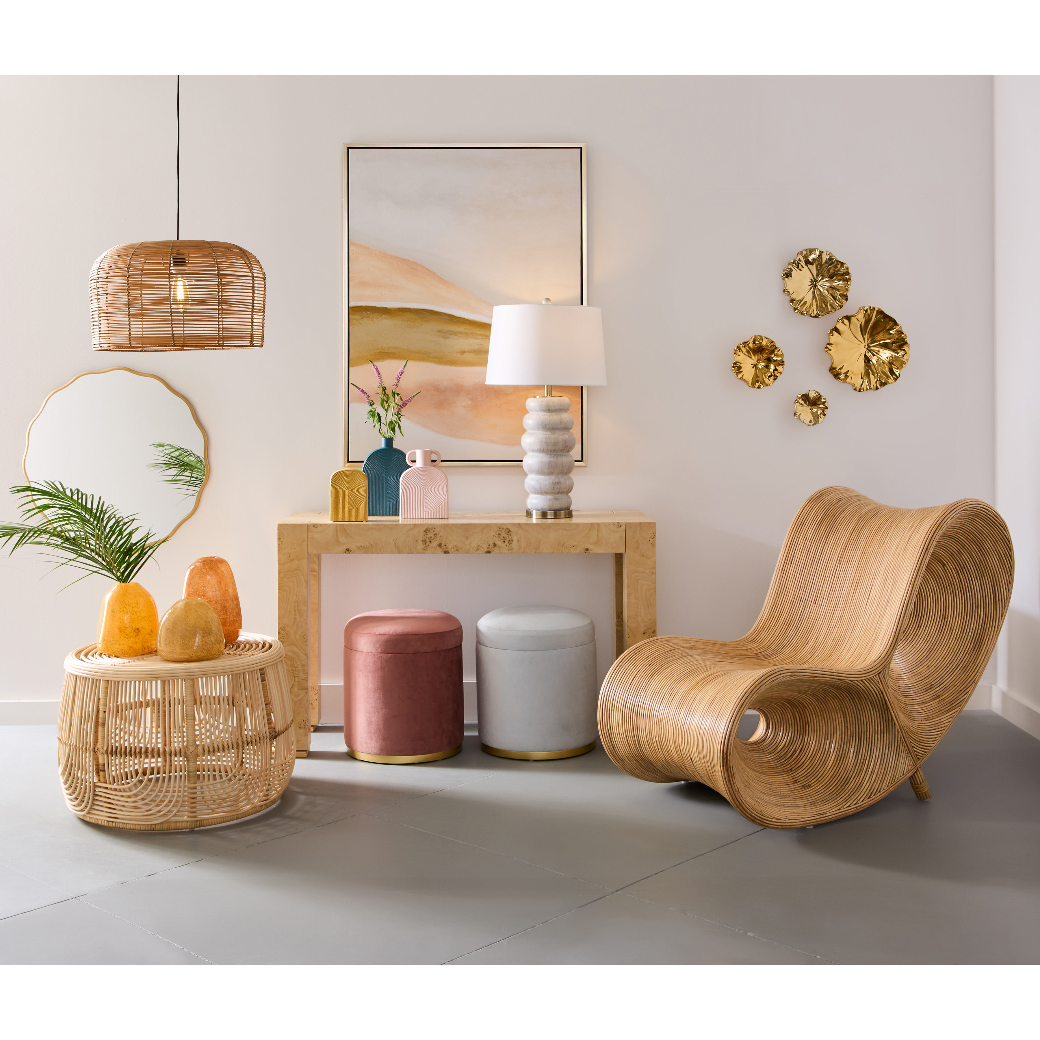The Etna Accent Table is a small rounded drum table with a curved vertical woven base made from rattan and a woven cane top. The material, which is not for outdoor use, is sustainable and durable materal and will last for generations when cared for properly.