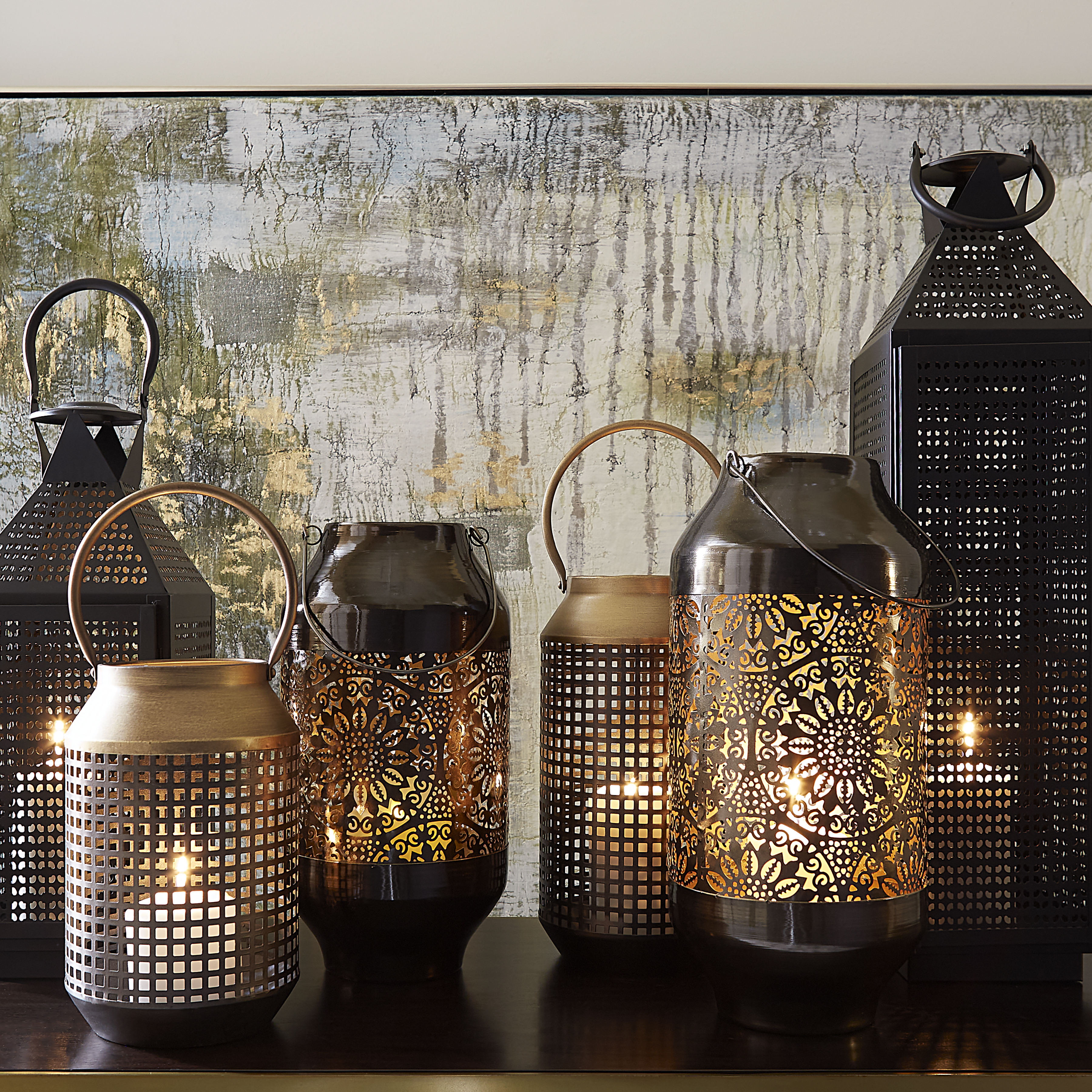 The Culler Lanterns, sold as a set of two, are metal lanterns perfect for adding a rustic element to a room or patio space. The open metal perforated mesh allows the candle light to create an atmospheric glow. These lanterns come in a textured bronze finish and are fitted with rounded handles.