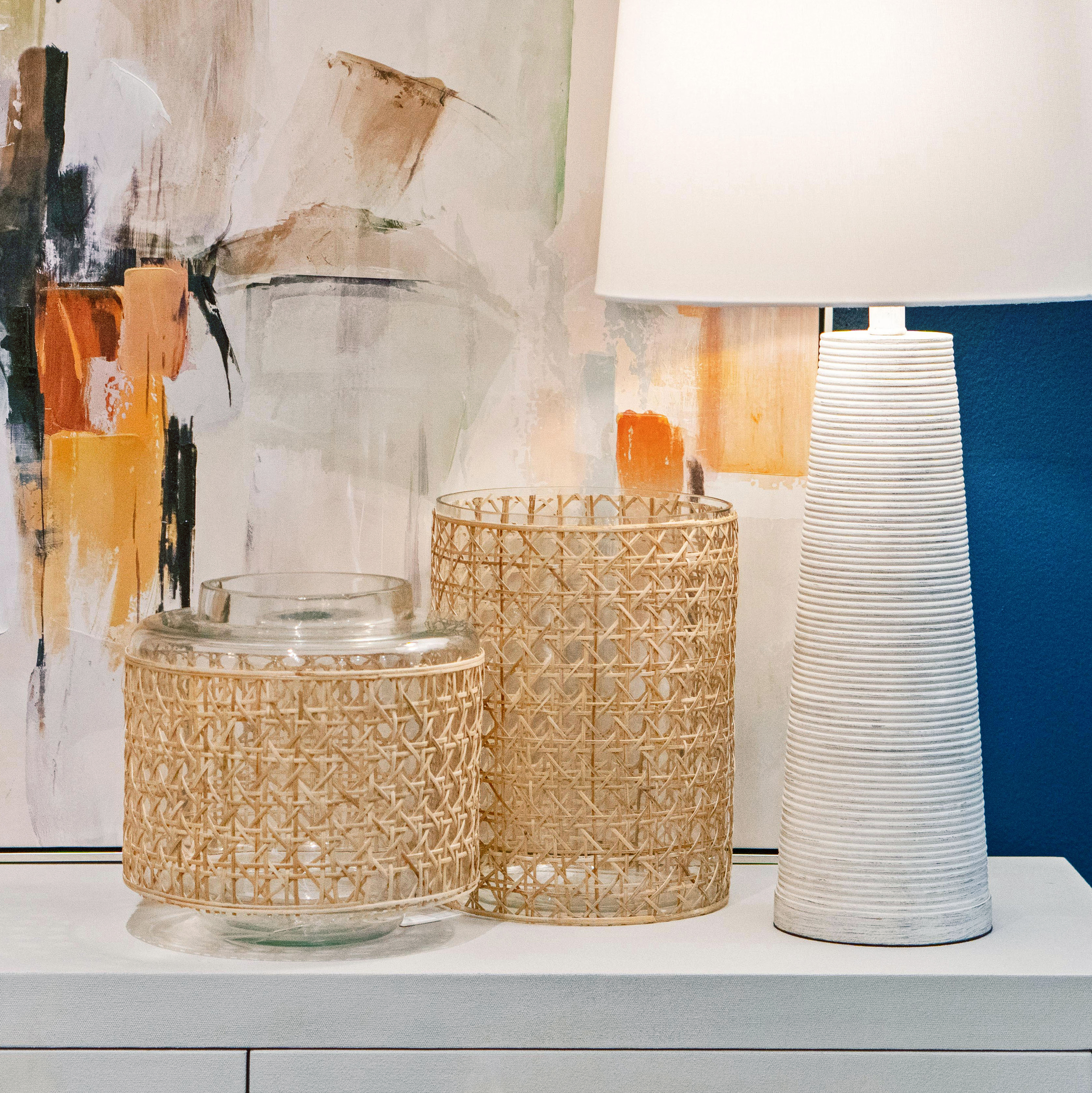 The Alys Small Vase features a wide cylinder of glass wrapped with rattan in a traditional webbed cane pattern. This vase has coastal appeal, and works in a variety of casual settings.